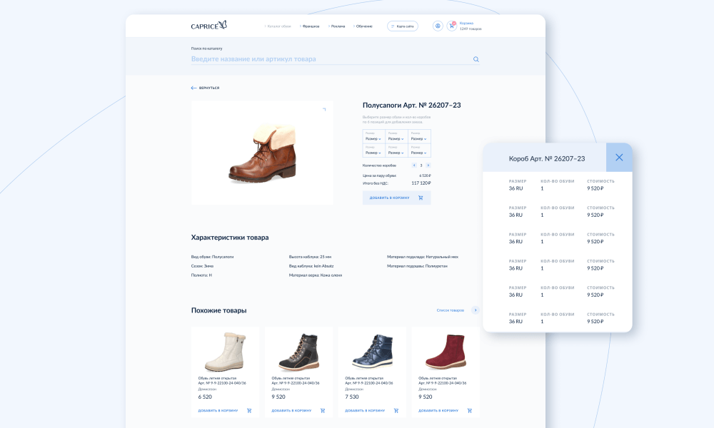 На сайте Caprice каталог реализован гибче: владельцы розничных магазинов сами решают, какие именно размеры им нужны, и самостоятельно формируют короба. Это создает конкурентное преимущество и снижает порог входа для новых дистрибьюторов при первичной закупке.