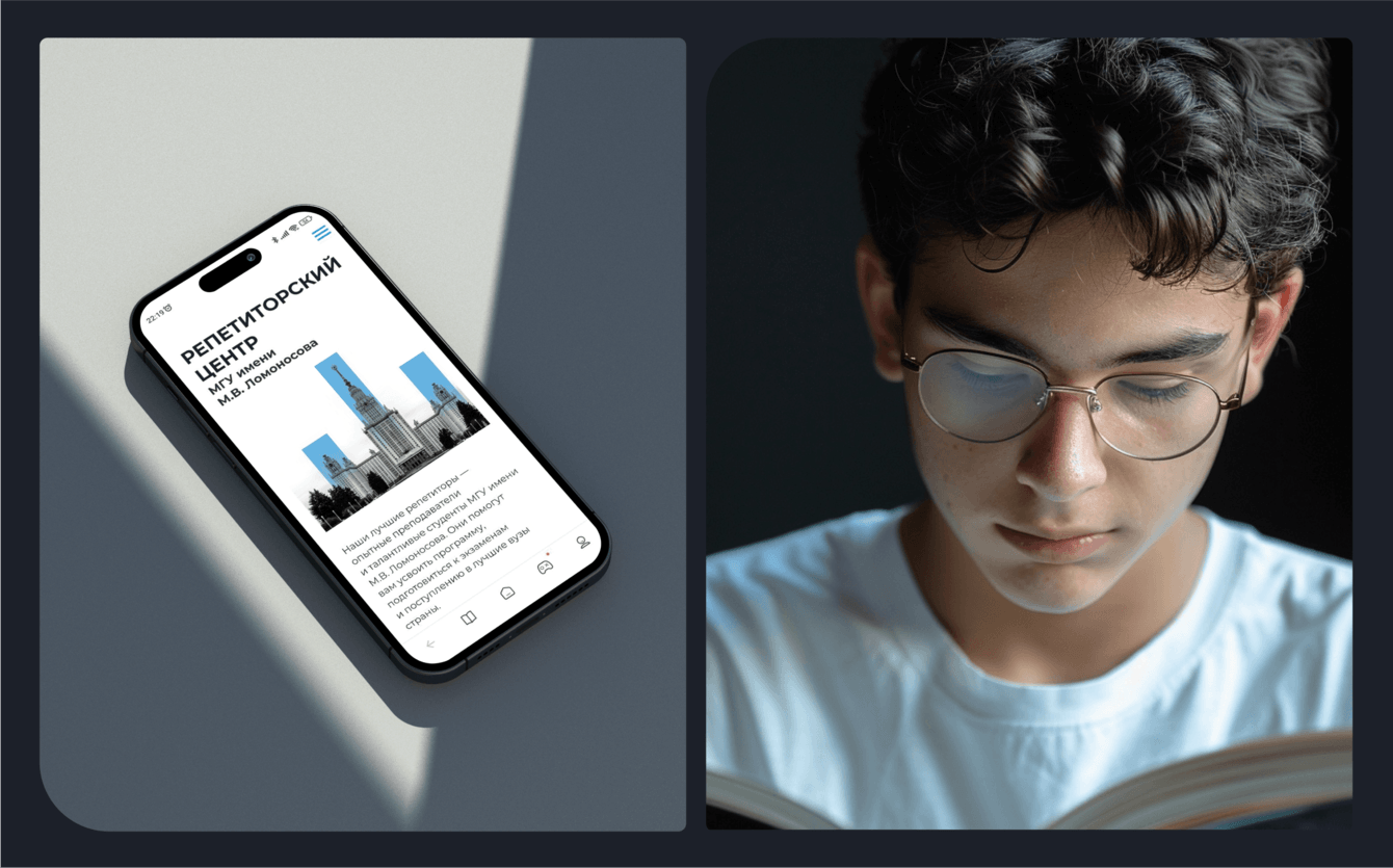 К нам обратился заказчик — представитель Репетиторского центра при МГУ имени М.В. Ломоносова. Было необходимо сделать редизайн сайта и изменить характер бренда — выбрать более серьёзный, сдержанный стиль. С одной стороны, необходимо отграничиться от конкурентов-репетиторов с «детским стилем» и молодёжной подачей. Репетиторский Центр позиционирует себя как серьёзное место подготовки при МГУ имени М.В. Ломоносова. С другой стороны, уход в строгий минималистичный дизайн не требовался, потому что компания хотела сохранить дружелюбность и доброжелательность к школьникам, абитуриентам и студентам.