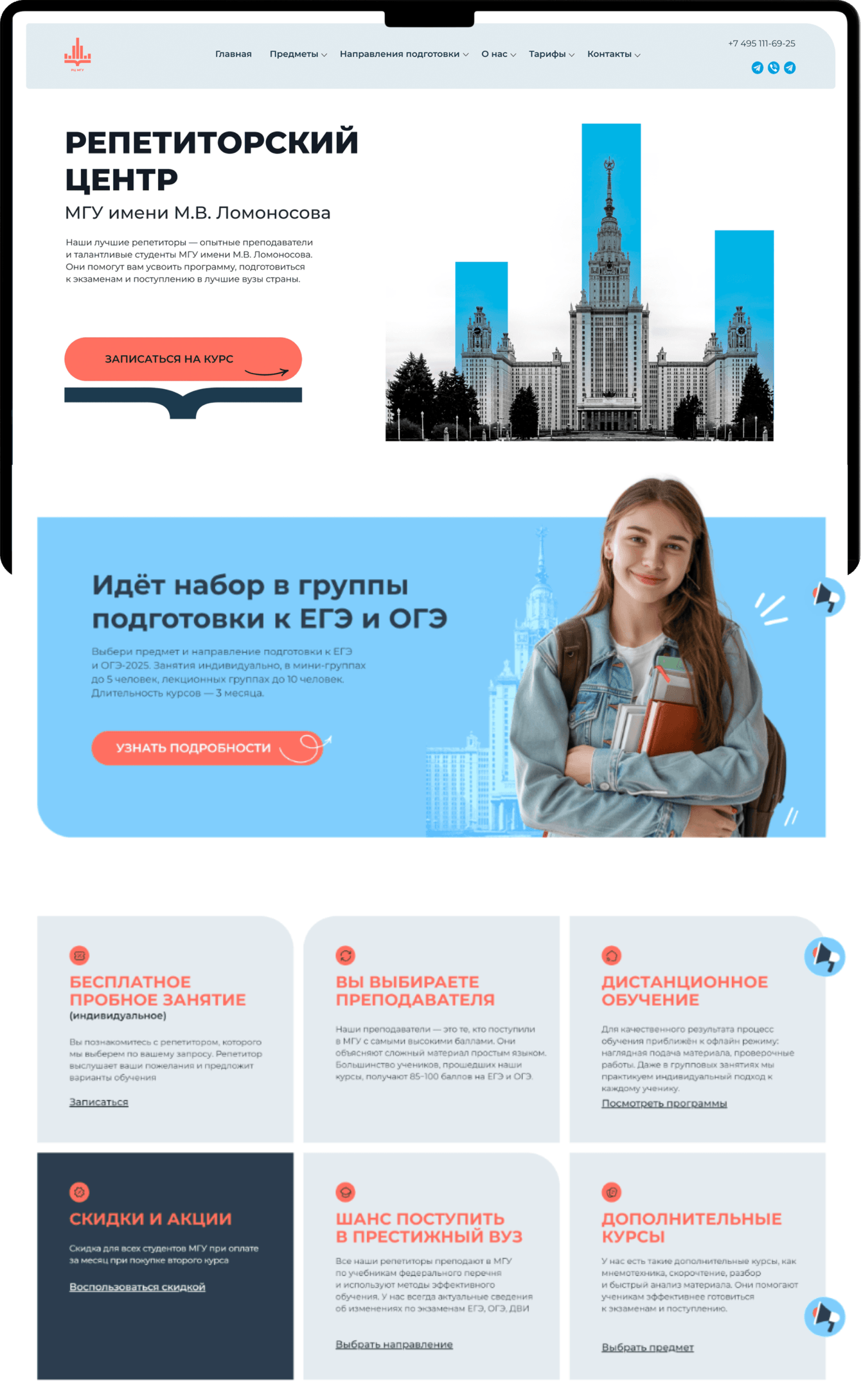 По замыслу заказчика на сайте необходимо было отразить направления подготовки по отдельным предметам и экзаменам — ОГЭ, ЕГЭ и ДВИ. Кроме того, в Репетиторском центре есть дополнительные факультативы для студентов, курсы повышения квалификации, мнемотехника и т.д. В итоге получился многостраничный сайт с двухуровневым меню. В общей сложности — около 25 страниц.