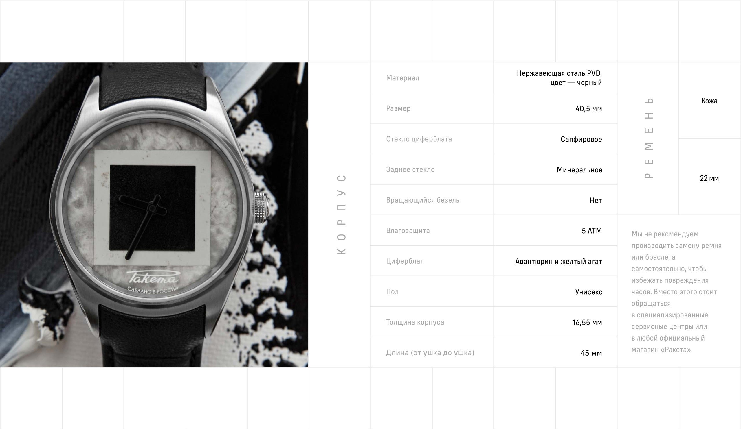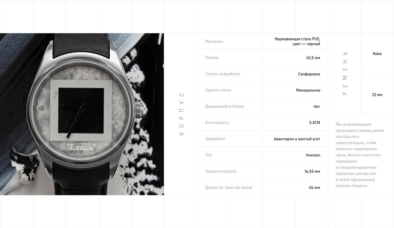 Задача редизайна сайта — презентация опыта, экспертизы и верности часовому искусству. Бренд обладает богатой трехсотлетней историей — достижения «Ракеты» — это не только достижения завода, но и страны. Сайт призван стать проводником в историю бренда и его каталога изящных моделей.