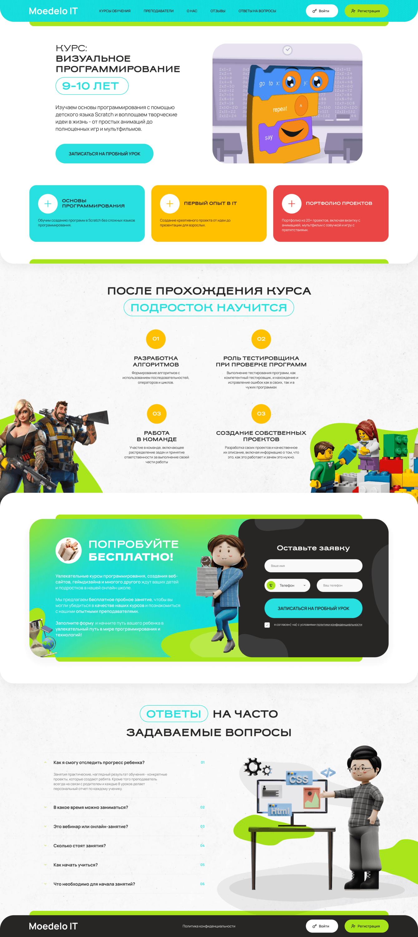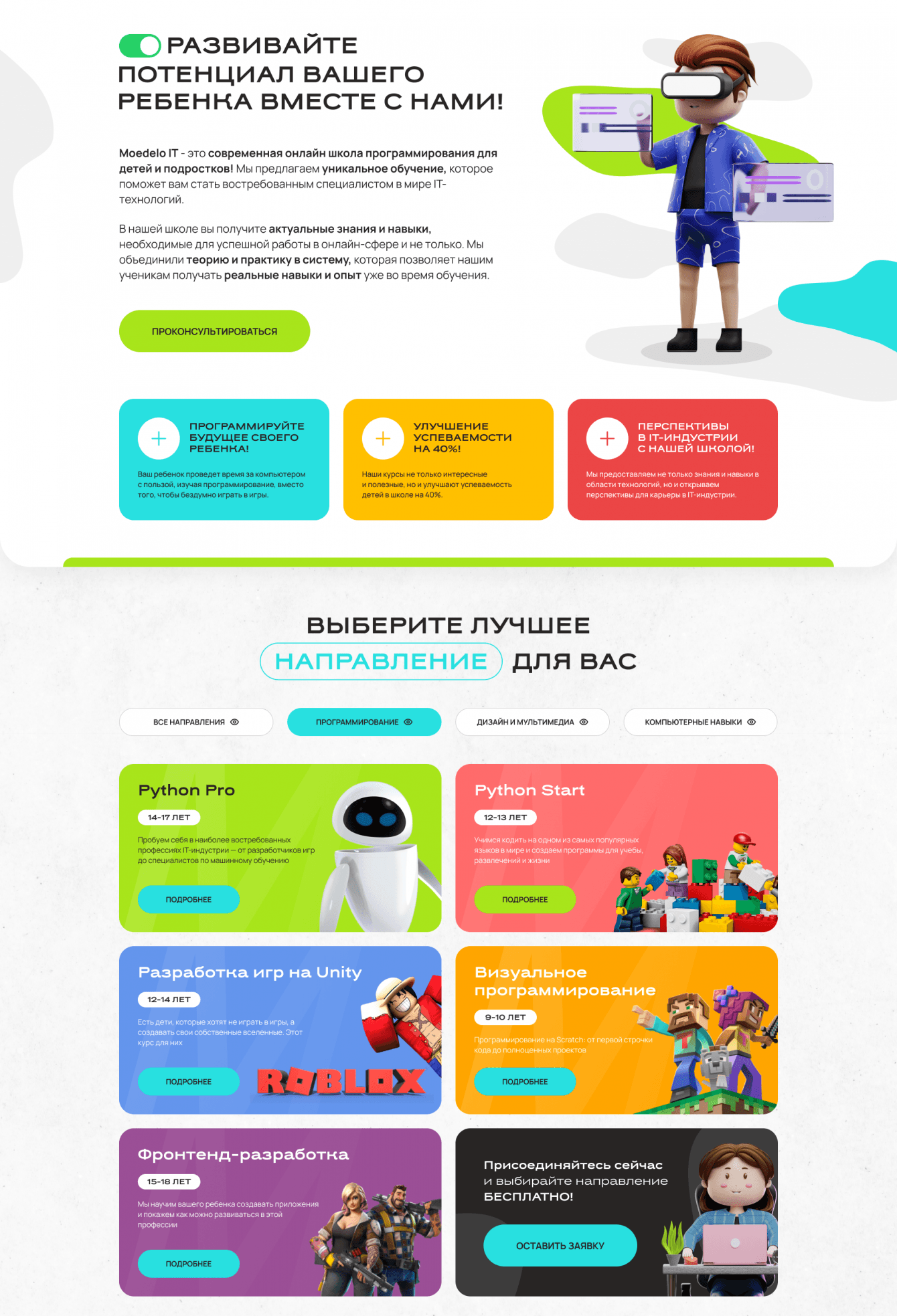 Проект создания сайта для детской школы программирования — это уникальная возможность для детей и их родителей получить доступ к современным технологиям и образовательным программам. При проектировании чётко продумана структура сайта, с учётом целевой аудитории сайта и главных его будущих пользователей — учеников. Сайт содержит информацию о школе, ее программе обучения, расписании занятий и преподавателях. Также на сайте будут размещены статьи и видеоуроки по различным темам, связанным с программированием. Кроме того, на сайте предусмотрена возможность зарегистрироваться на курсы и получить доступ к онлайн-курсам. А родителям — смотреть в личном кабинете прогресс обучения и успеваемости своих детей. Сайт имеет удобный интерфейс, который позволит детям легко находить нужную информацию и выполнять задания. Такой сайт для детской школы программирования поможет привлечь новых учеников, повысить интерес к обучению и расширить возможности для развития детей в области информационных технологий.