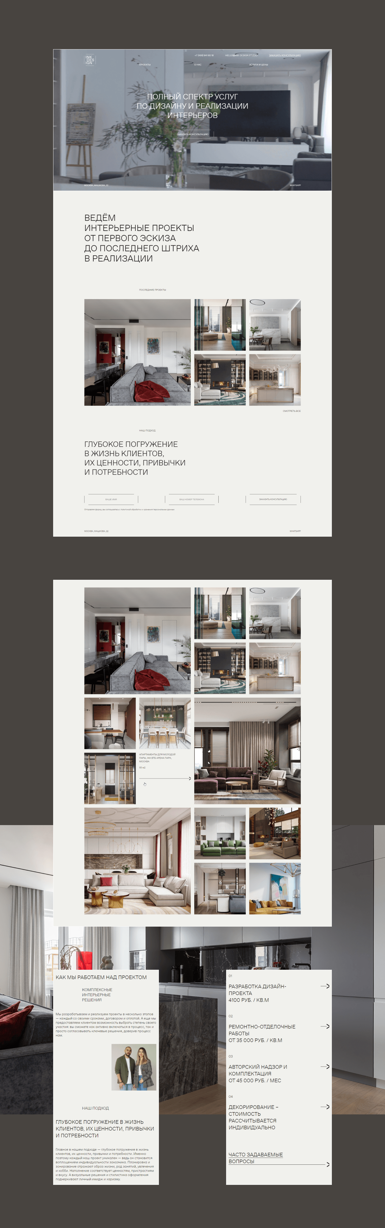 Требовалось разработать корпоративный сайт для дизайн-студии интерьеров. Важно было подчеркнуть дизайнерский характер и "тонкий" стиль, который доступен не только для премиальной аудитории.