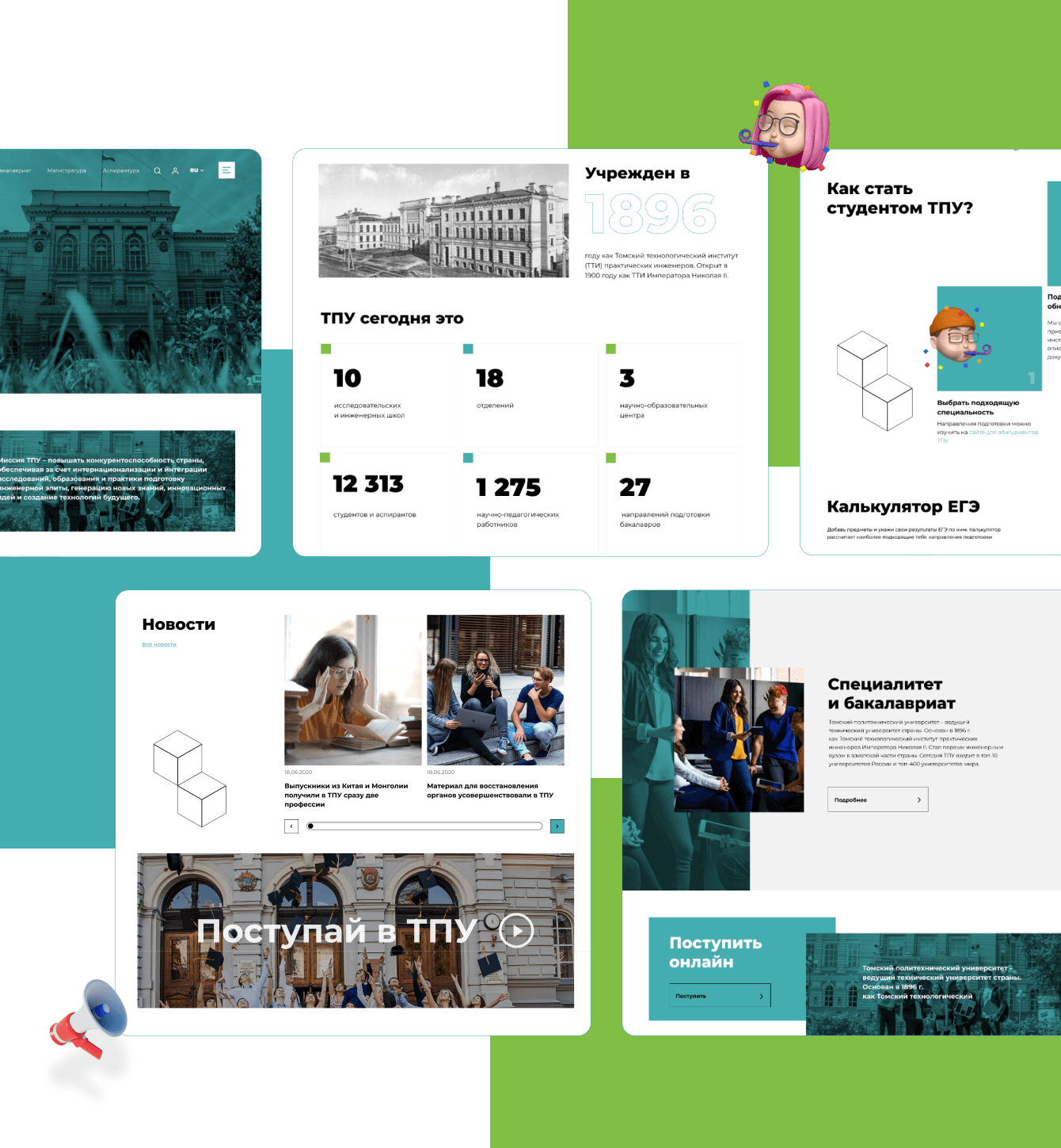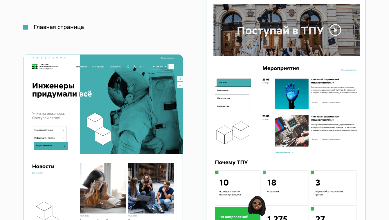 Нашей задачей было разработать современную, динамичную версию сайта для абитуриентов вуза, которая бы убеждала посетителей сайта становиться инженерами и начинать свой путь в ТПУ. Мы разработали набор 3D-иллюстраций для сопровождения контента на сайте. Создать непринужденную атмосферу также помогли анимодзи и анимации. На главной странице сайта абитуриент может выбрать своего любимого инженера в истории и последовать его примеру - сайт подскажет, на какую специальность необходимо поступить, чтобы стать не менее выдающимся изобретателем. Слоган "Инженеры придумали все" и другие тексты сайта помогают абитуриентам проникнуться их будущей профессией и вдохновиться перспективами, которые она открывает.
