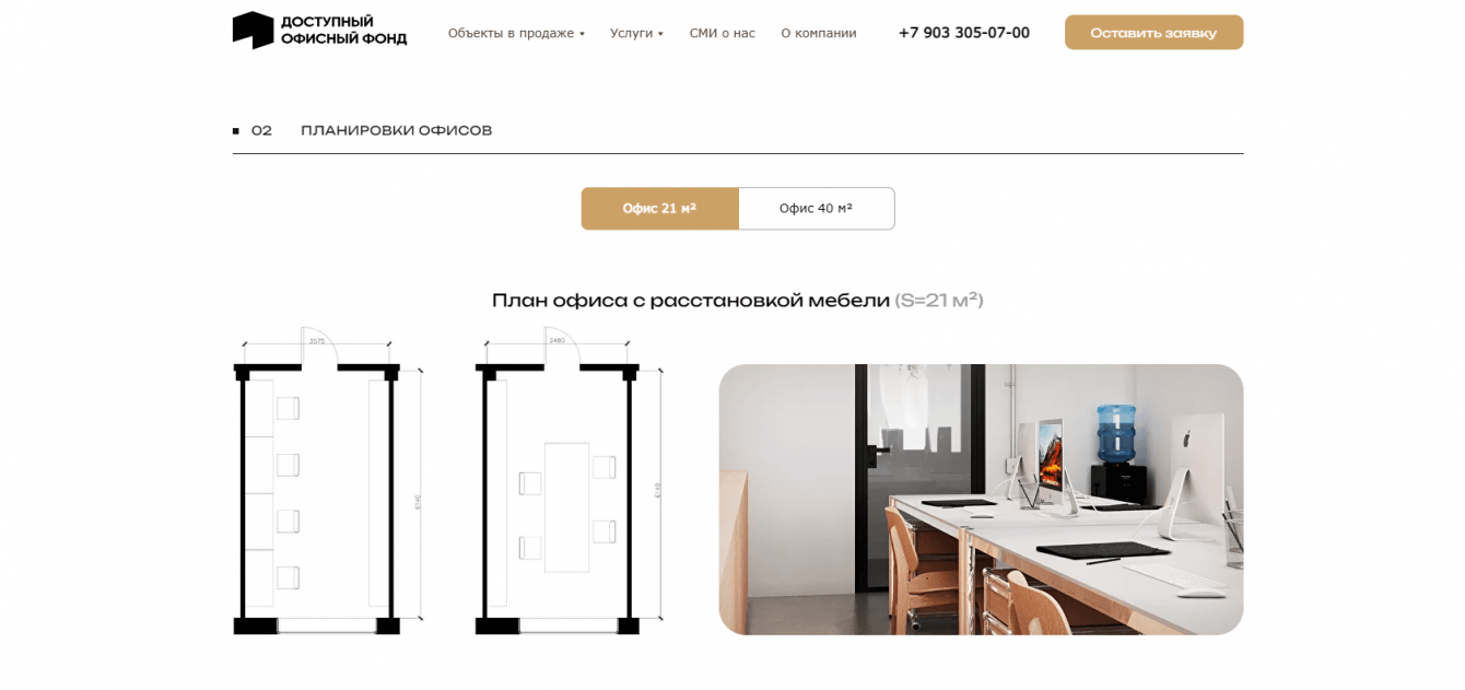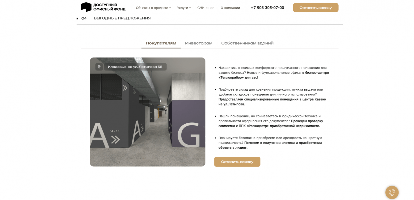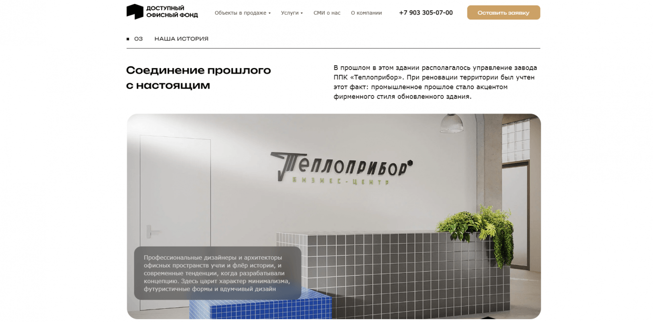 Сделали акцент на двух основных объектах недвижимости, которые нужно было продавать прямо сейчас: офисный центр "Теплоприбор" и кладовые помещения. Всю важную информацию по традиции выделили в шапке: услуги, стоимость, описание площади и информацию о компании. Там же поместили контактные данные и форму для сбора заявок для удобства. Затем разместили план этажей, фотографии, возможные планировки и оформление офисов. Заказчик отказался от интерактивного варианта планировок, поэтому мы использовали статичные изображения.