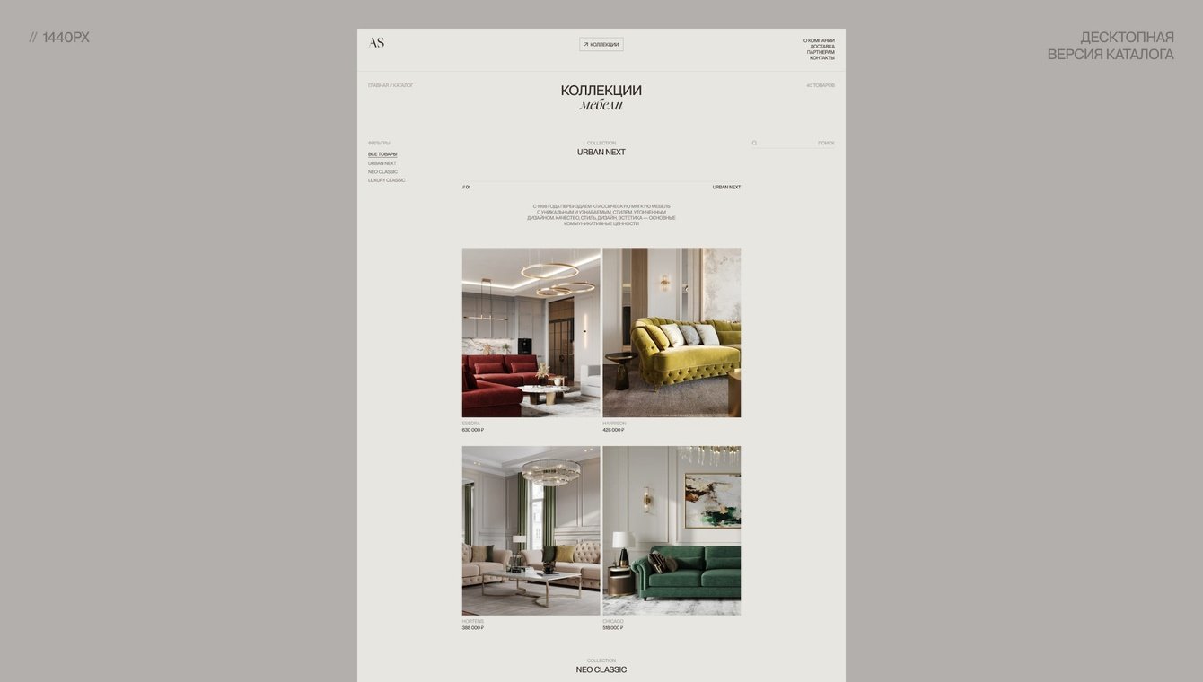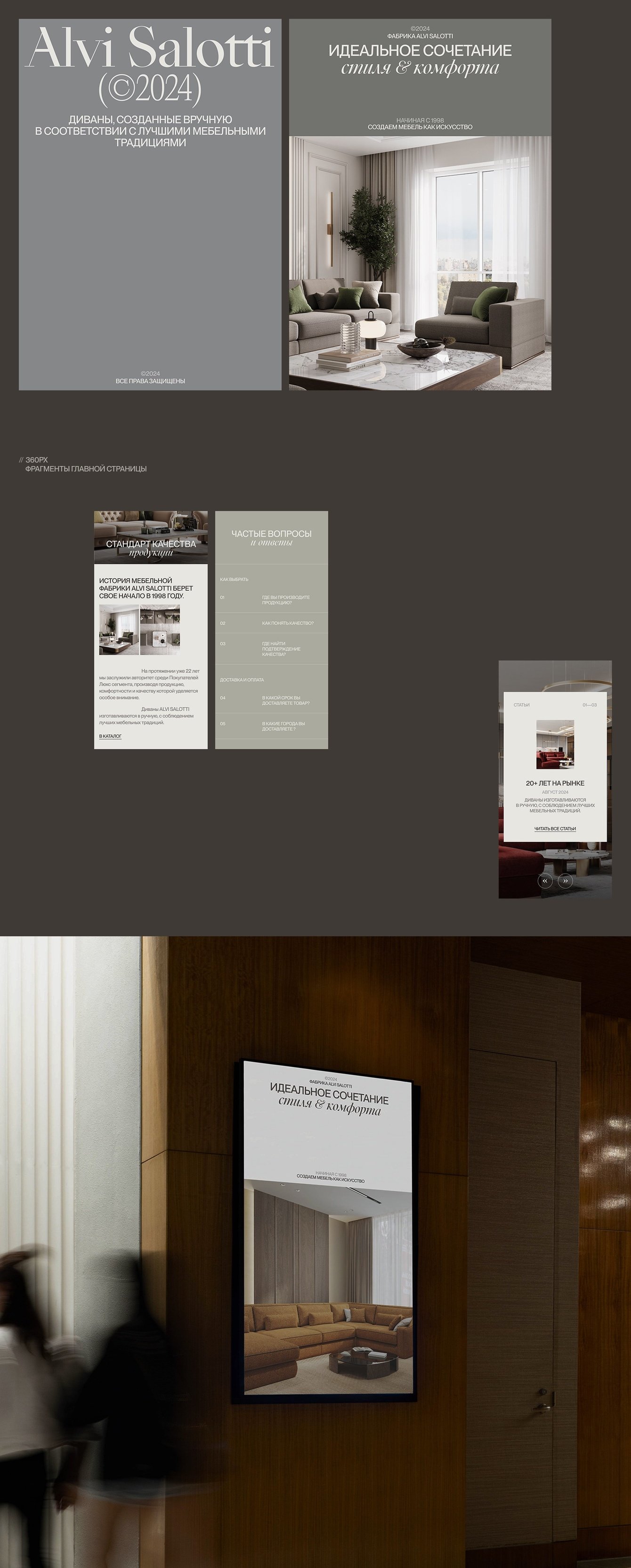Создали дизайн с акцентом на фото продукции Alvi Salotti. Благодаря этому сайт не перетягивает на себя внимание, а скорее обрамляет товары бренда — так что и классическая, и современная мебель органично смотрятся на нем.