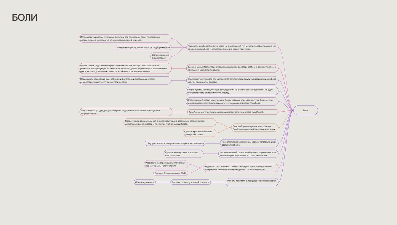 Мы изучили отзывы о производителях мебели РФ, которые есть в открытом доступе (искали на Яндекс Картах и на сайтах-отзывах). А также собрали с клиента боли пользователей по взаимодействию со старым сайтом Alvi Salotti.