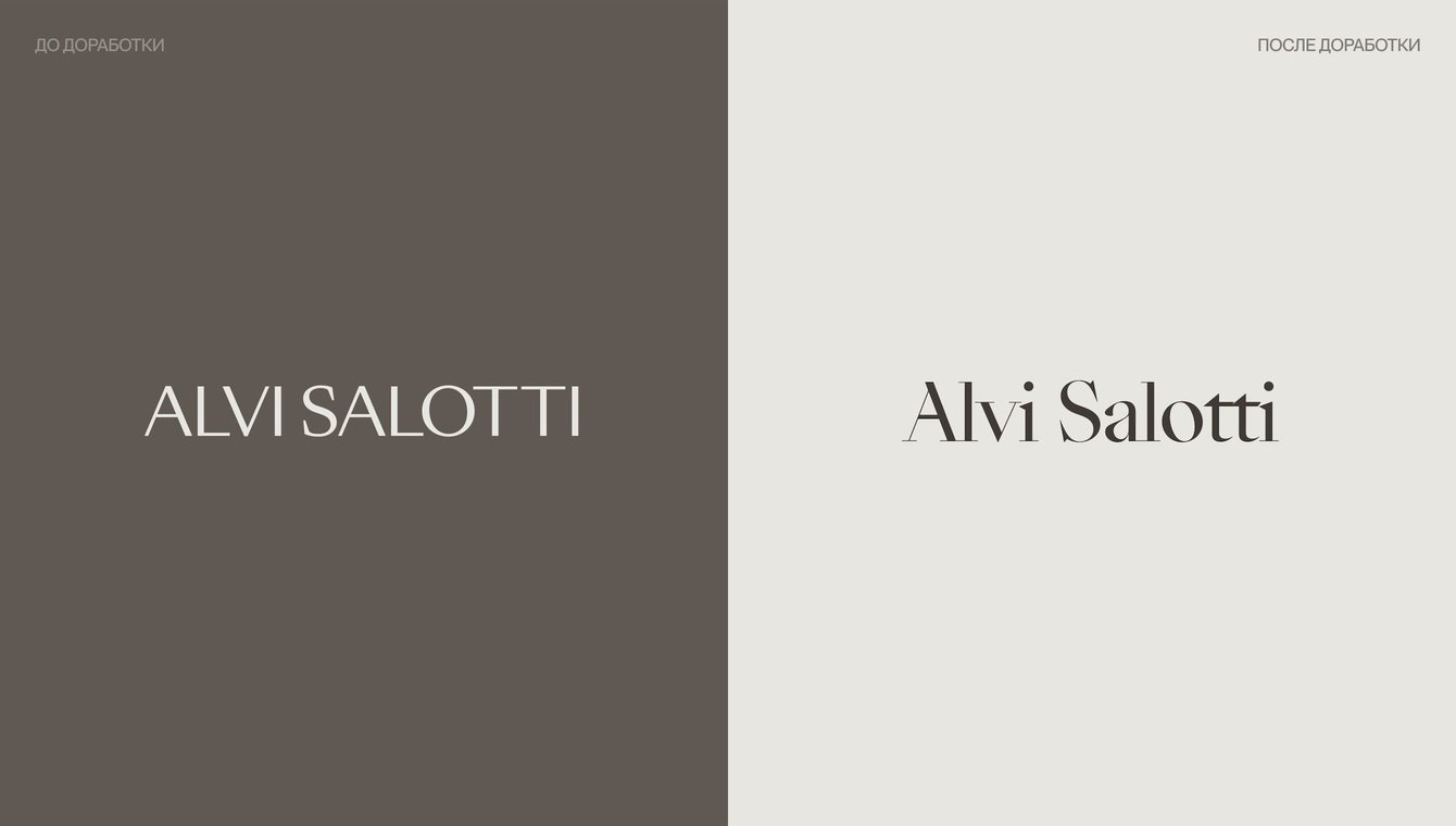На этапе дизайна решили немного доработать брендинг Alvi Salotti и скорректировали логотип компании. Такой вариант лучше смотрится в диджитал-версии, добавляет изысканности и выглядит современнее.