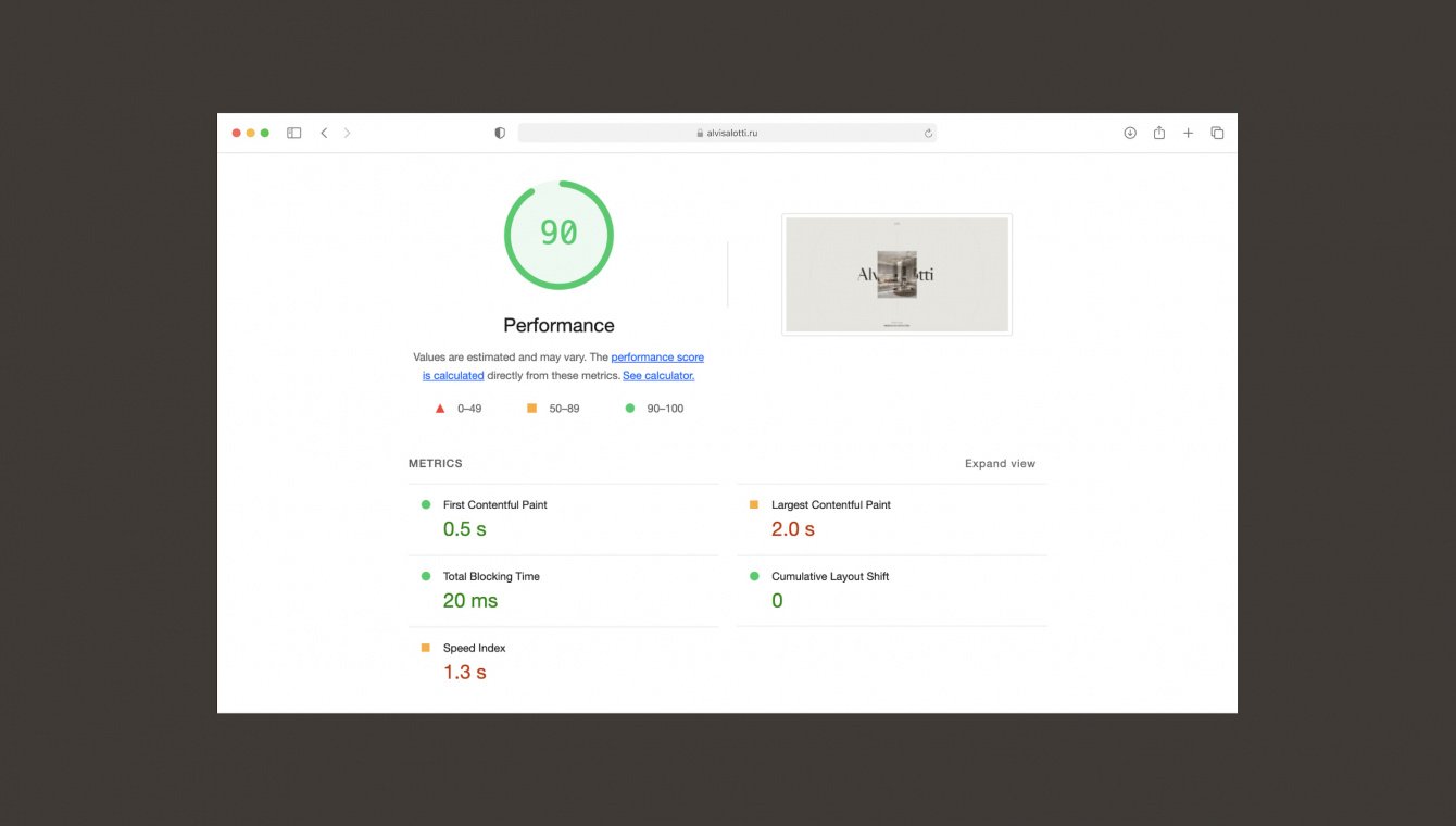 Кроме того, сайт быстро работает, несмотря на обилие анимаций на нем: показатель performance достигает 90 из 100 баллов, по результатам тестирования десктопной версии сайта в Lighthouse (что соответствует высокой скорости загрузки).