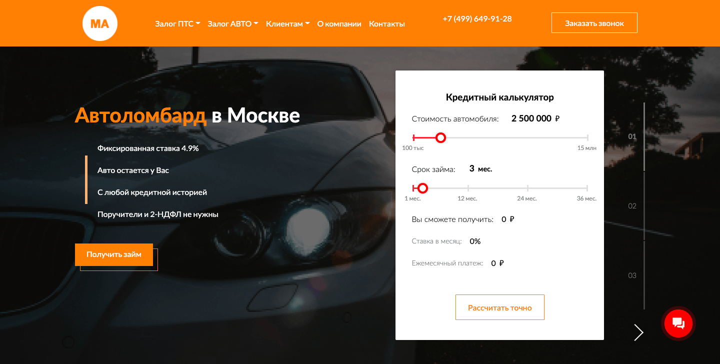 Разработать официальный сайт для автоломбарда Moscow Autolombard - финансовой организации, которая выдает кредиты частным лицам и предпринимателям под залог транспортных средств или ПТС на автомобиль. Настроить контекстную и таргетированную рекламу. Провести внутреннюю и внешнюю оптимизацию сайта. Интегрировать CRM систему. Разработать фирменный стиль и логотип.