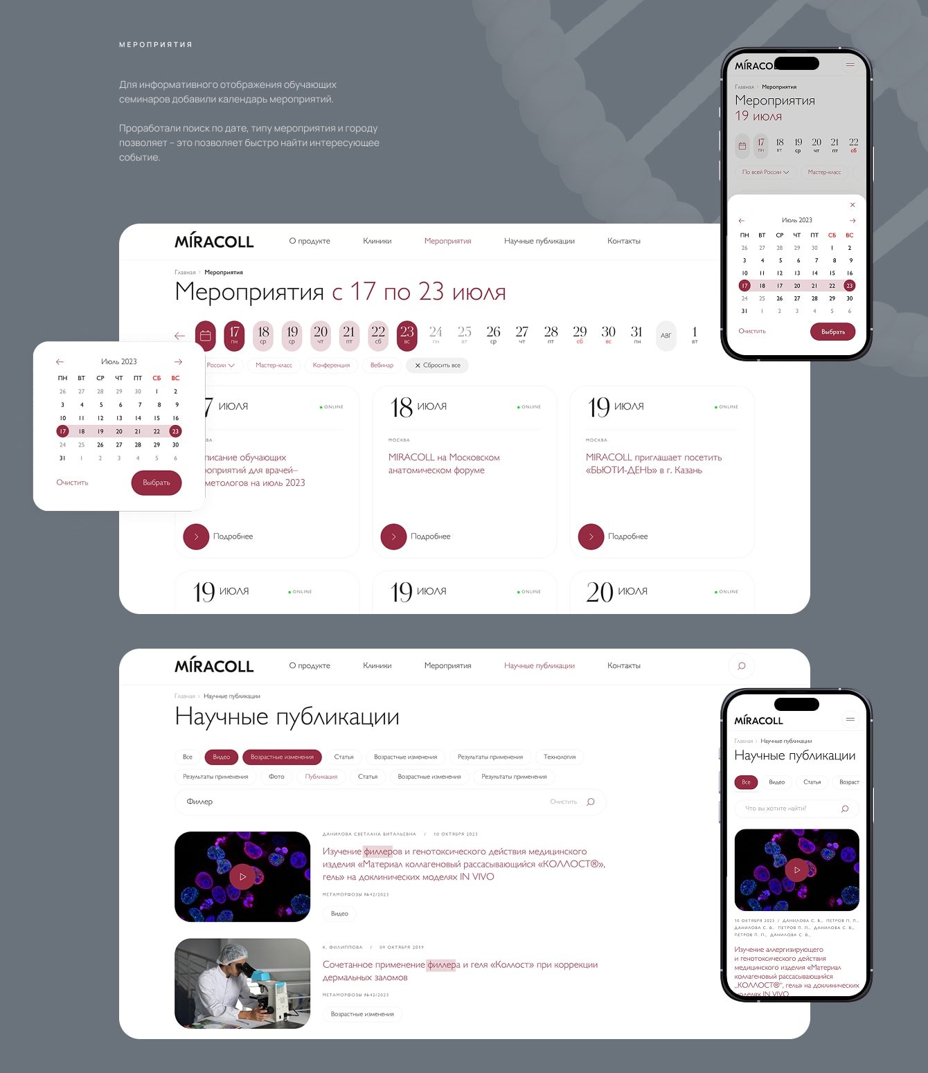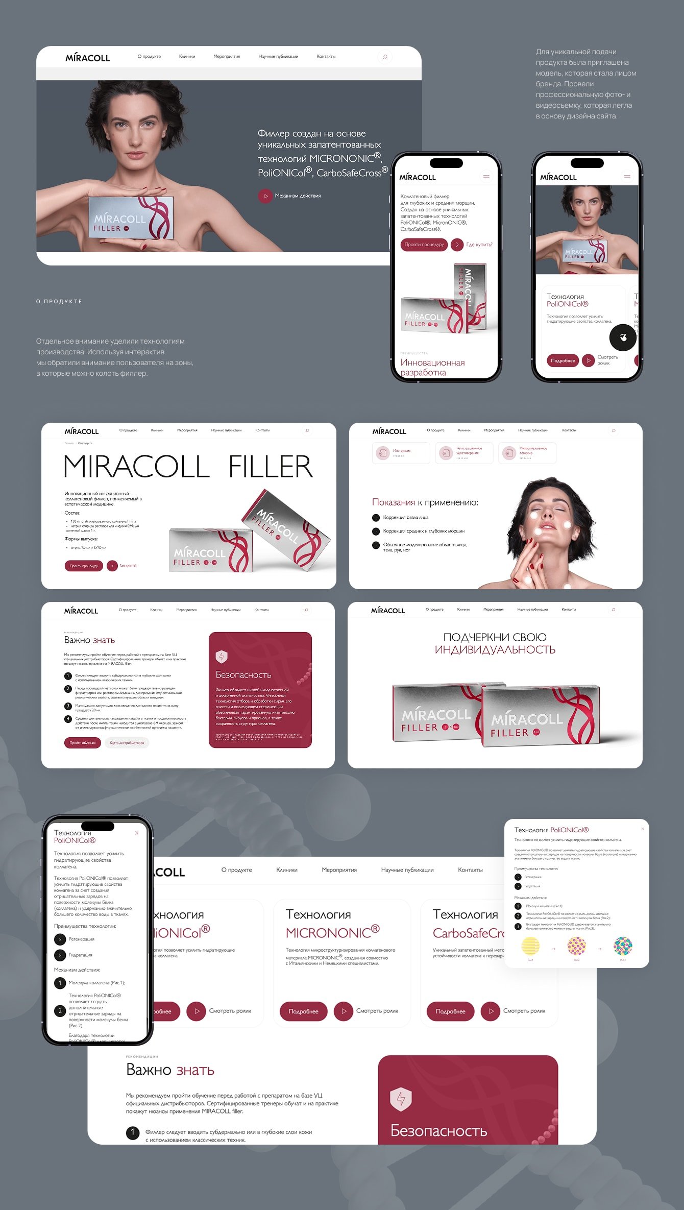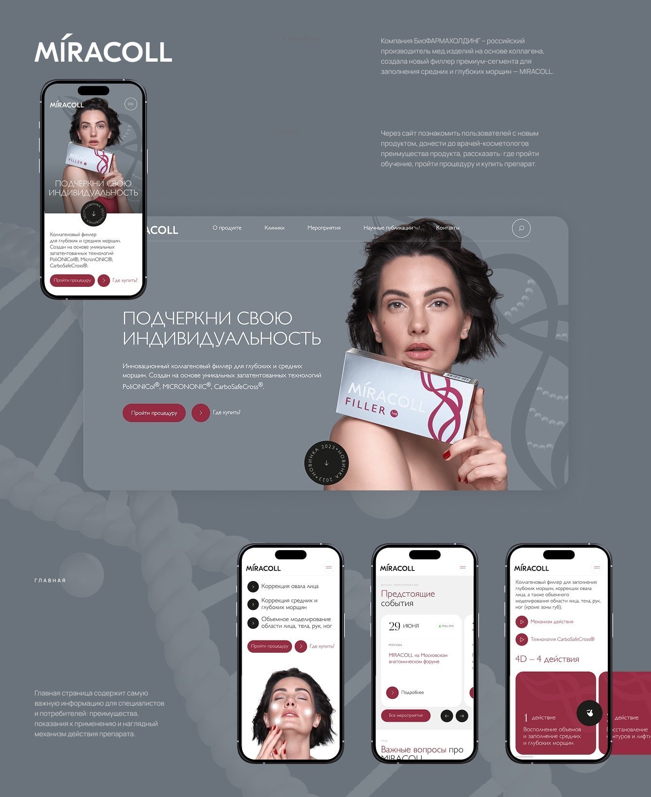 На ключевых страницах сайта мы подробно объясняем специалистам все преимущества MIRACOLL, включая его уникальные свойства и эффективность. Мы стремимся максимально раскрыть показания к применению, а также представить наглядный механизм действия препарата, чтобы косметологи и представители клиник могли уверенно рекомендовать MIRACOLL своим клиентам.