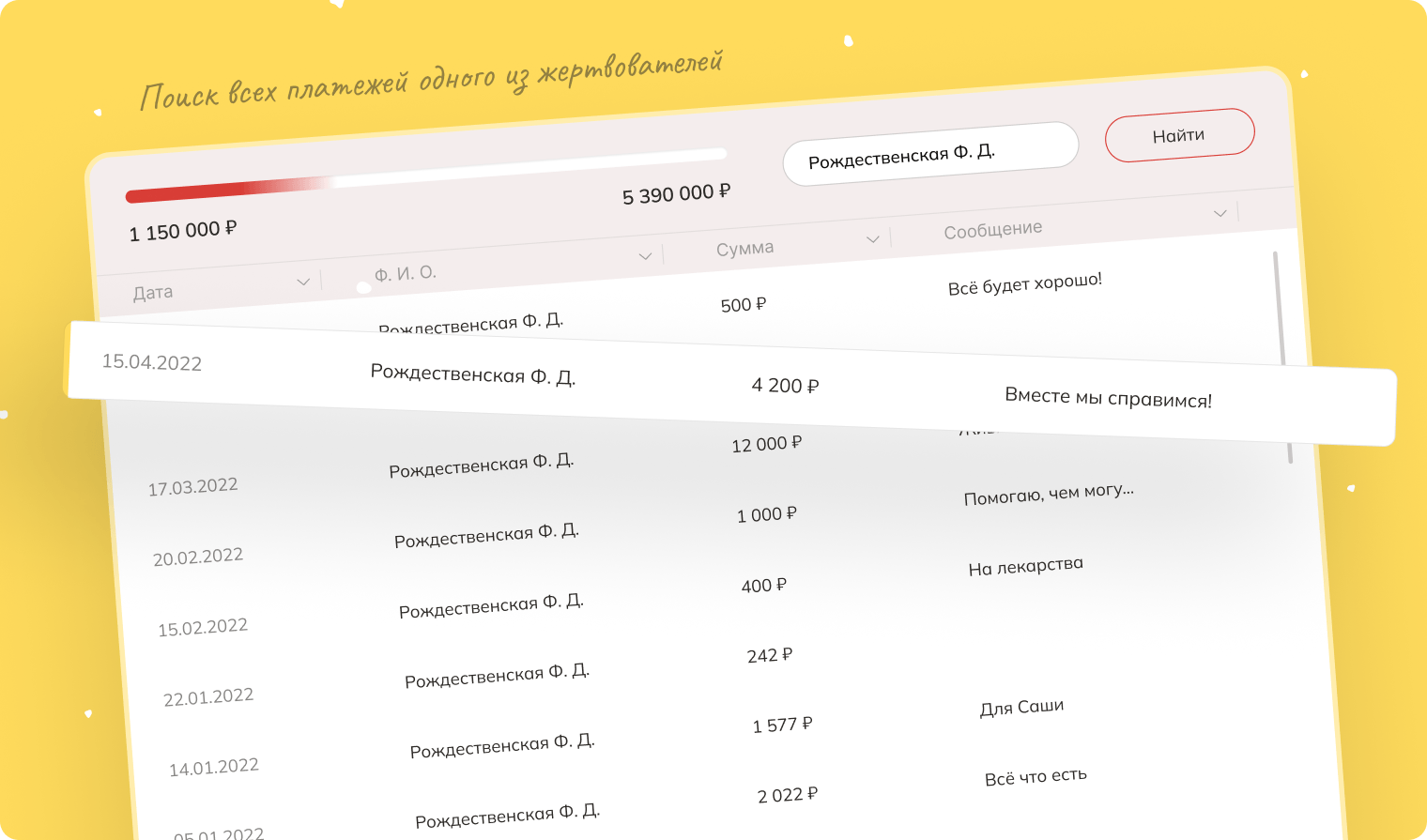 Ниже под формой отображается каждое пожертвование с небольшим текстовым пожеланием. Изначально был предусмотрен функционал фильтрации, сортировки и поиска для платежной информации.
