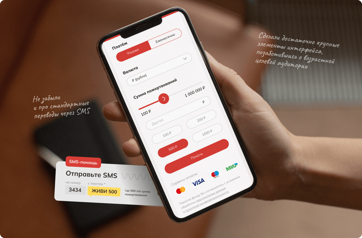 В конце каждой страницы с подопечным фонда располагается простая форма для пожертвований, в которой можно выбрать частоту платежей и их размер. Здесь мы учли привычные пользователям интерфейсные паттерны использования похожих платежных форм на сайтах банков, и поэтому разместили вариации способов внесения денежных сумм.