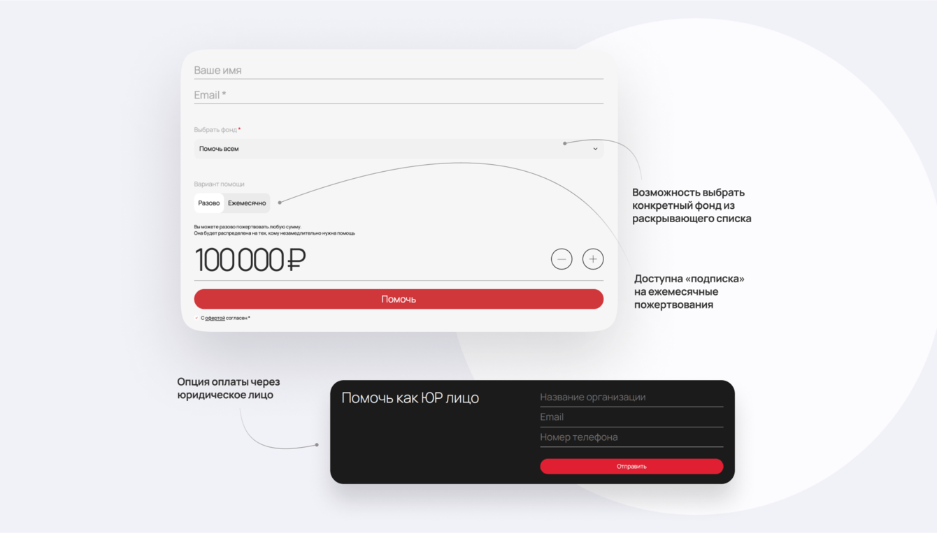 Клиент под NDA – фонд по привлечению средств для распределения по благотворительным фондам.