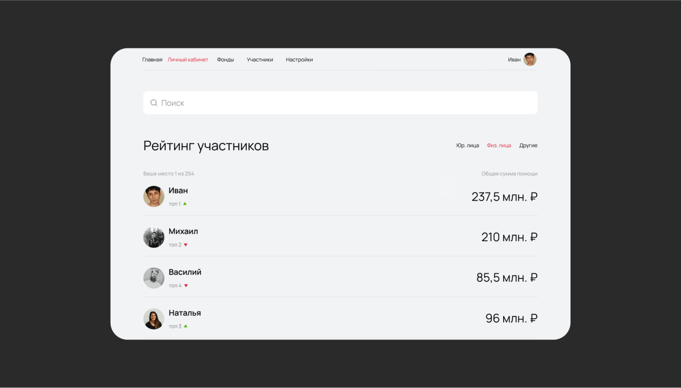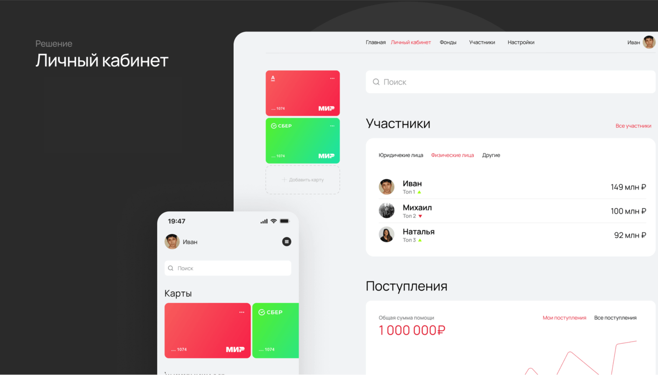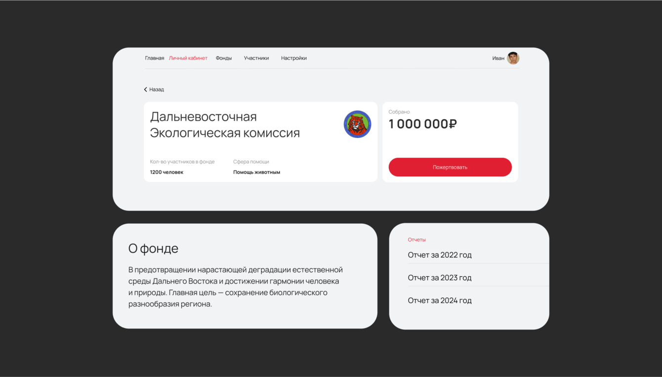 Личный кабинет – пространство для членов фонда. При его создании было важным предусмотреть понятный и удобный интерфейс, а также продемонстрировать максимальную прозрачность для участников.