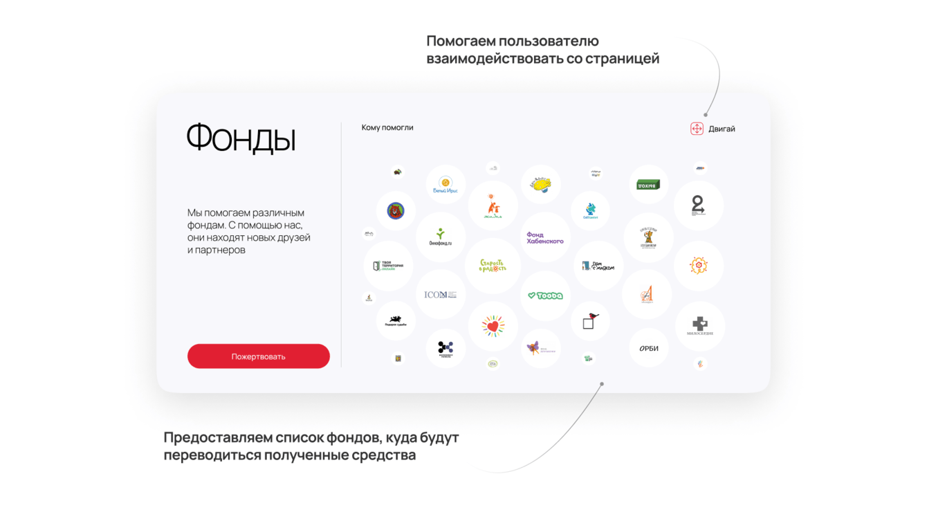 Главная страница сайта выполнена в фирменных цветах компании. Основная цель страницы – сбор средств для благотворительных фондов. Поэтому предусмотрели кнопку, которая следует за пользователем по нарисованной траектории.
