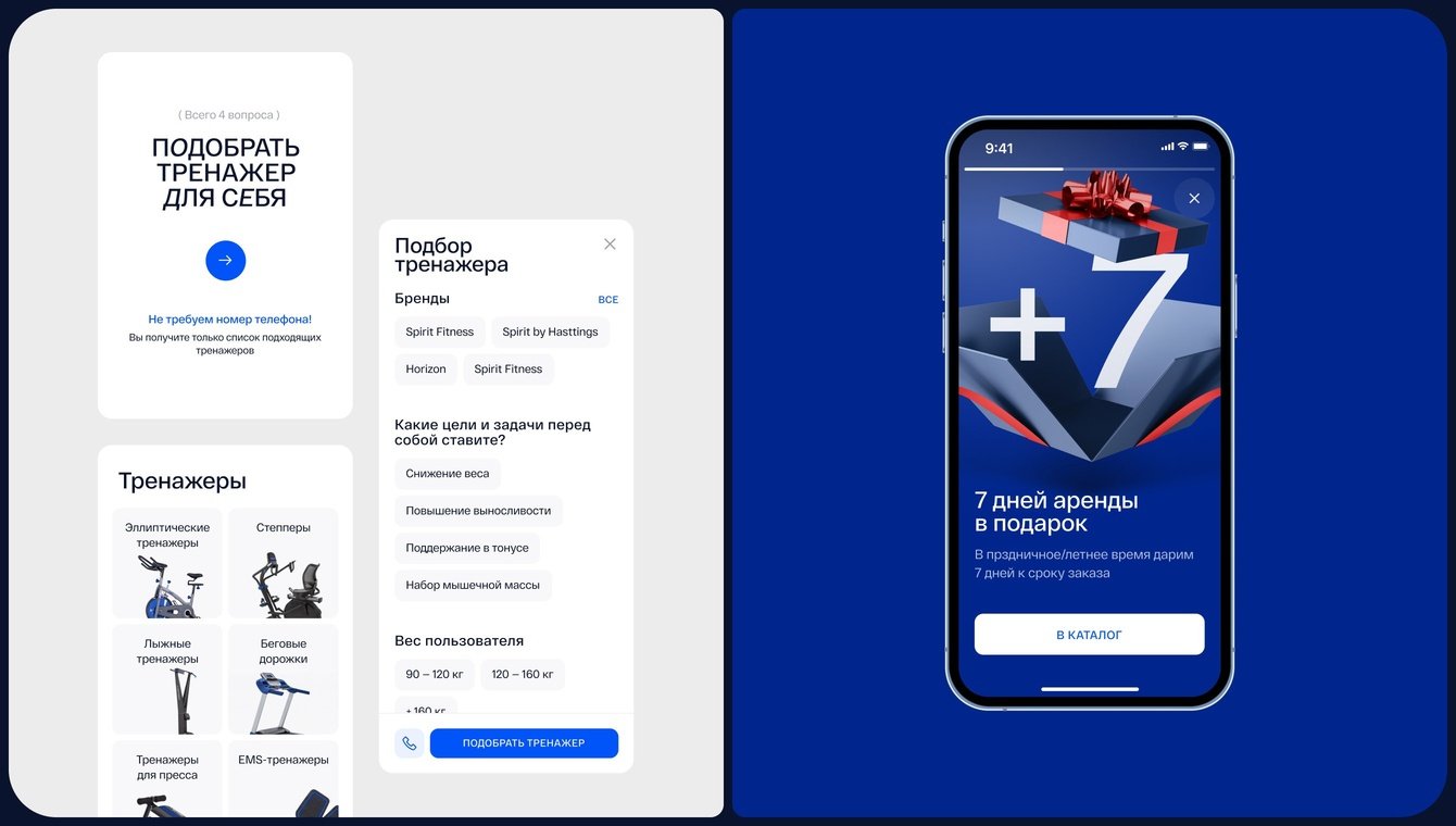 Также создали помощника в подборе тренажеров (пока mvp-версию). Выглядит он так: пользователь тапает на текст «Подобрать тренажер для себя» и получает список вопросов: рост, вес пользователя, бренд и тип тренажера. После заполнения мини-анкеты ему высвечивается набор товаров, которые подходят под его требования.