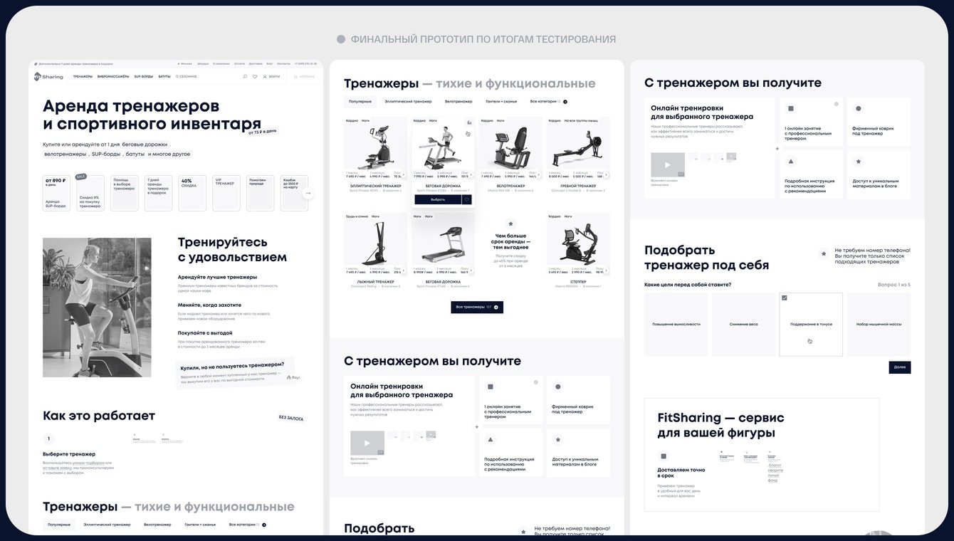 Поэтому мы провели коридорное тестирование: 9 глубинных интервью с потенциальными клиентами. На созвонах мы показывали респондентам 4 варианта обезличенных ч/б-сайтов: 2 сайта конкурентов, прототип сайта FitSharing от предыдущего подрядчика и наш прототип. По каждому из них проходились и собирали фидбэк: что понравилось, что испугало, какой информации не хватало, воспользовались бы этим сервисом и поработали бы с этой компанией и т.д. В конце созвона мы просили респондентов выбрать из четырех тот сайт, где они бы оставили заявку.