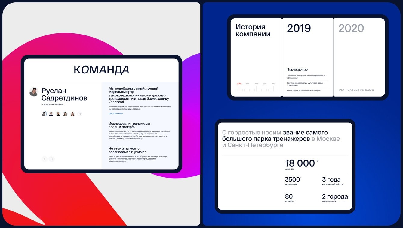 2.2 Чтобы повысить лояльность к бренду, в блоке «О компании» показали преимущества FitSharing перед конкурентами, подробно рассказали историю бренда и подсветили его ключевые лица.