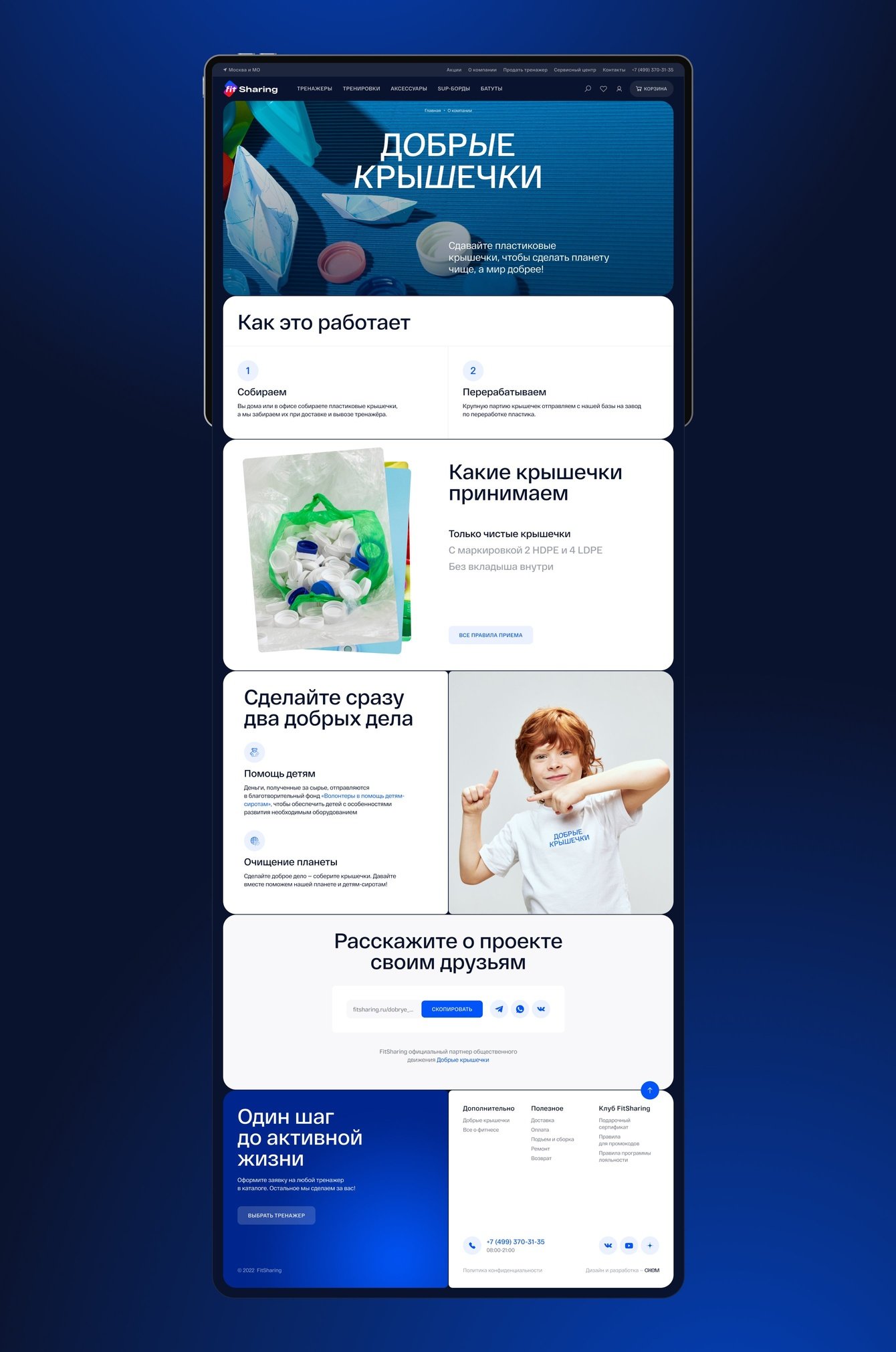 4.3 Обновили страницу под благотворительную программу «Добрые крышечки» от FitSharing: клиенты передают ненужные крышки курьерам FitSharing, компания их сдает на переработку, а полученные деньги идут в благотворительный фонд «Волонтеры в помощь детям-сиротам».