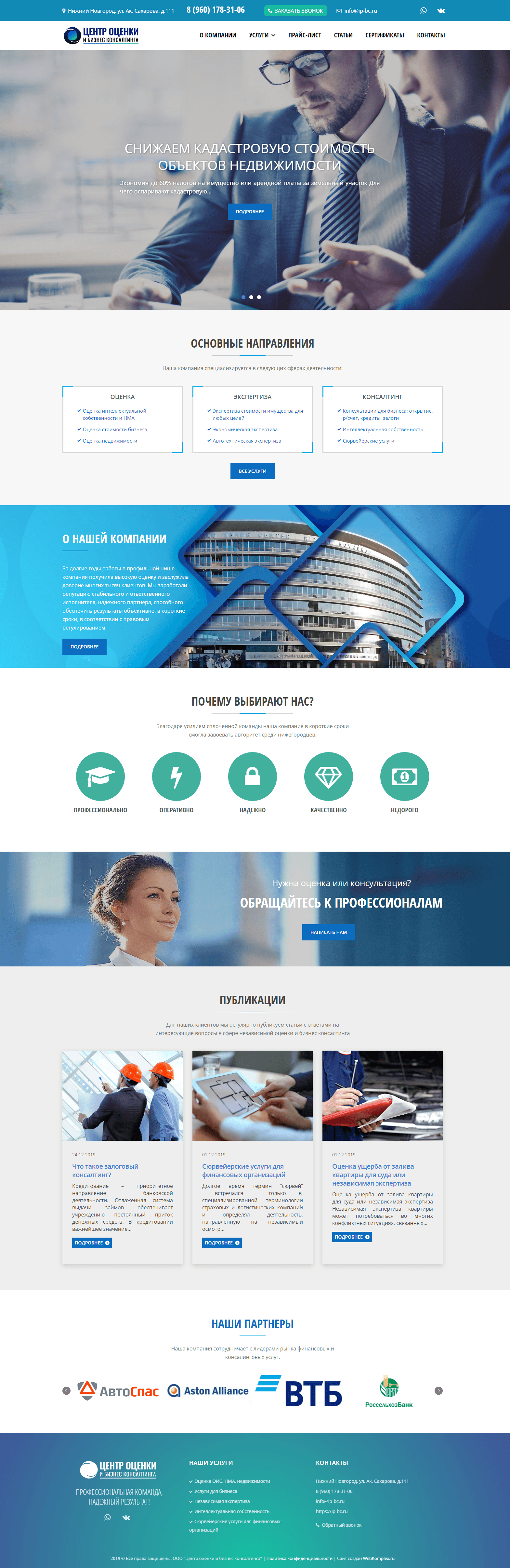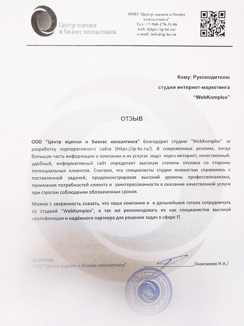 ООО "Центр оценки и бизнес консалтинга" благодарит студию "WebKomplex" за разработку корпоративного сайта. В современных реалиях, когда большую часть информации о компании и их услугах ищут через интернет, качественный, удобный, информативный сайт определяет высокую степень отклика со стороны потенциальных клиентов.