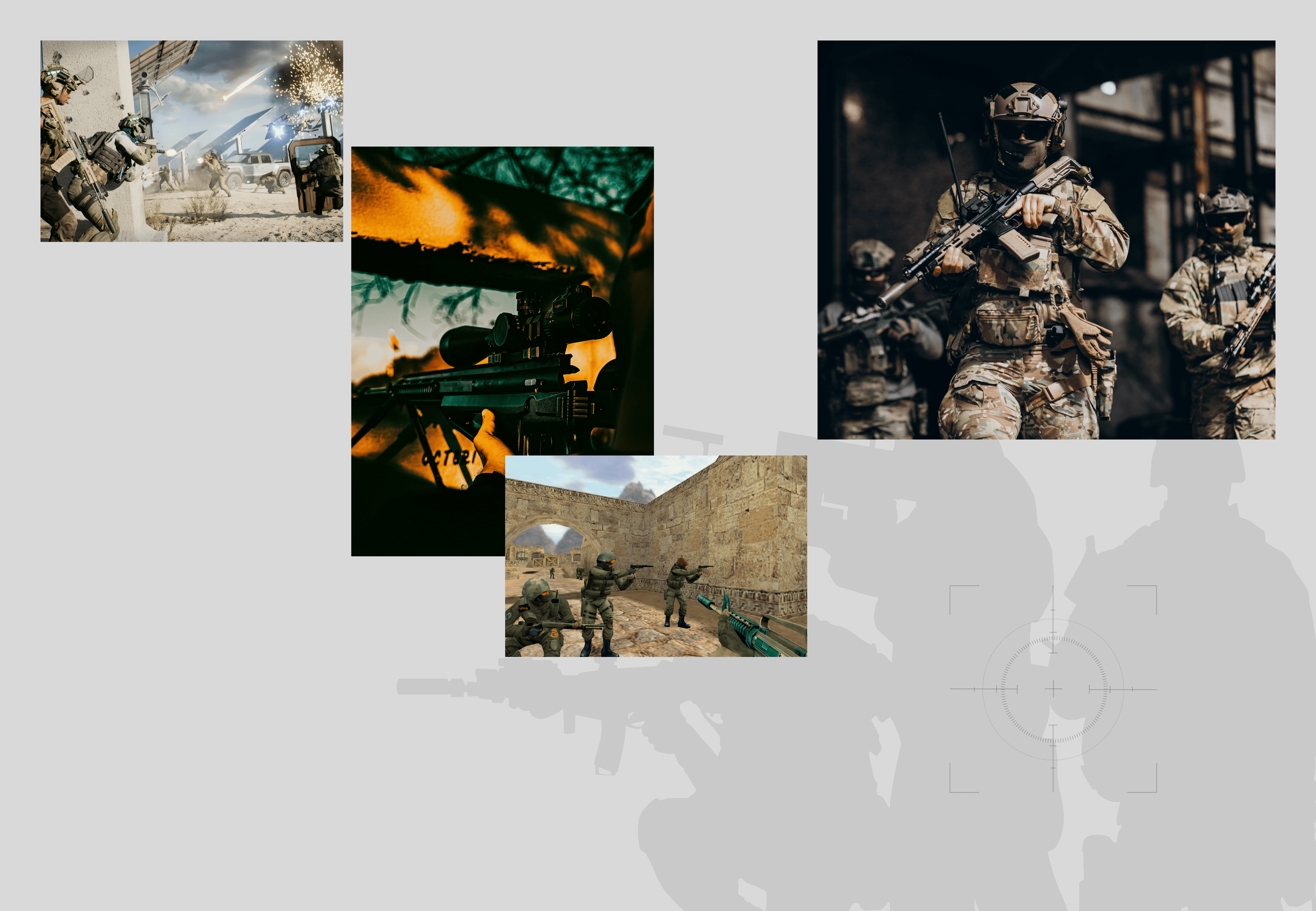 Анализируя сайты прямых конкурентов с точки зрения дизайна, мы точно убедились, что нужно искать “фишку”, “изюминку” в визуальном стиле, чтобы компания “Близнец” отличалась от остальных. Мы начали искать ассоциации. При слове “охрана” в голове появляется образ, состоящий из людей в форме со спец. оружием, прицелы и …шутеры.