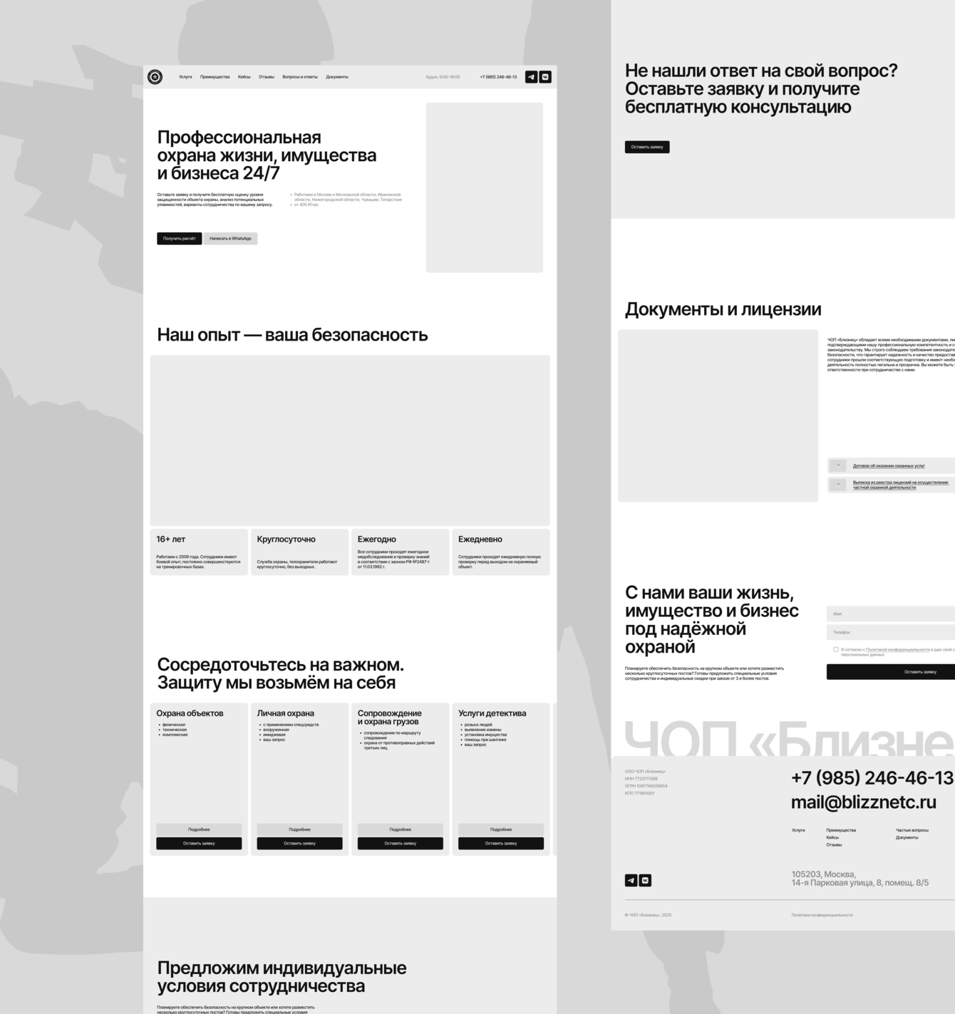 Мы разработали не просто очередной сайт частного охранного предприятия, а создали визуальный образ компании, который имеет запоминающийся стиль, привлекает аудиторию, повышает статусность компании “Близнец”, а также в полной мере раскрывает ее услуги и позиционирование.