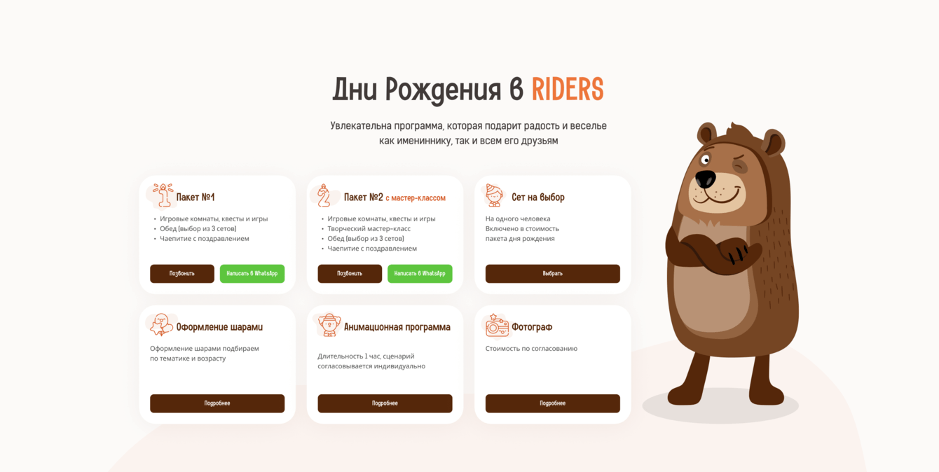 Наш сайт не только решил задачи заказчика, но и стал удобным инструментом для пользователей при планировании отдыха. Мы учли все потребности и пожелания клиентов Raders. Родители отмечают, что наш сайт выделяется среди конкурентов на курорте — яркий дизайн вызывает положительные ассоциации и надолго запоминается, что, в свою очередь, способствует повышению лояльности пользователей.