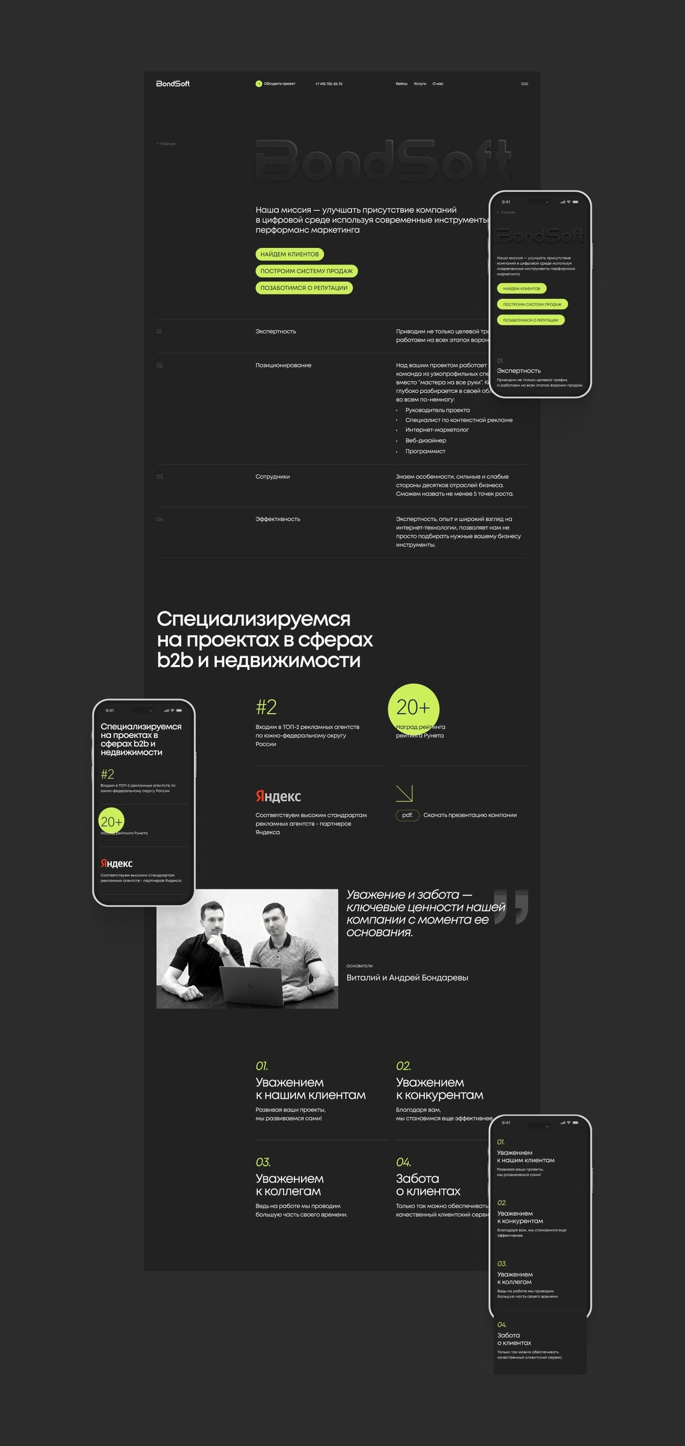 Мы очень довольны результатом и взаимодействием с командой Бондсофт! В процессе работы мы несколько раз переделывали концепт первых экранов и нашли идеальный вариант. Мы круто вложились в анимацию. В результате, я считаю, что дизайн и анимация получилась на уровне топовых мировых сайтов.