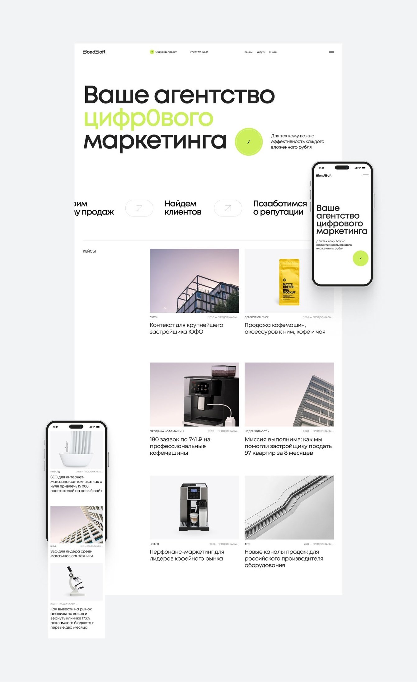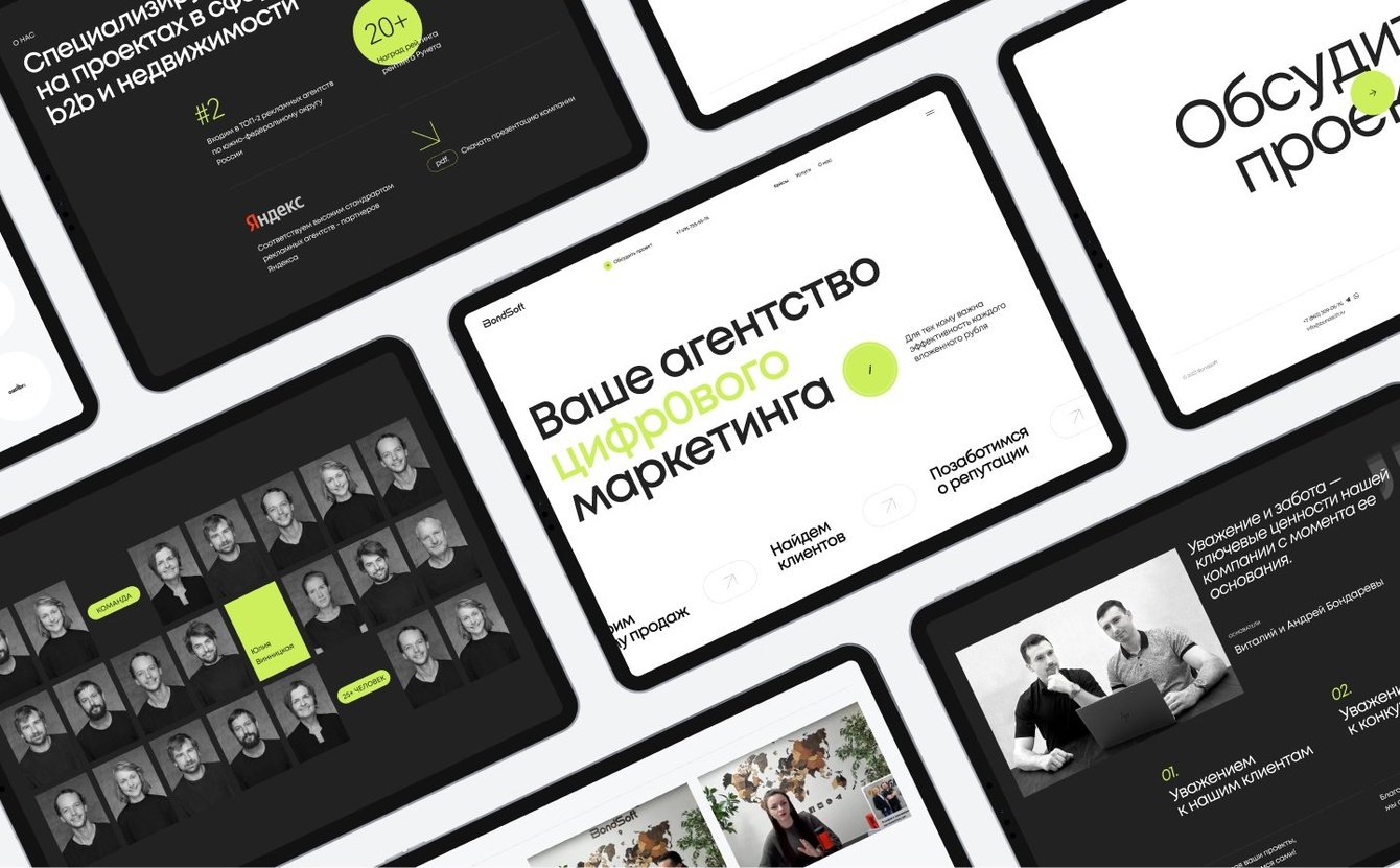 Создать современный сайт для диджитал агентства. В дизайне отразить сильные стороны компании, показать кейсы в лучшем виде. Дизайн сайта должен быть современным, стильным и эстетичным, без перекоса на креатив. Результат должен увеличить количественные и качественные показатели по привлечению клиентов.