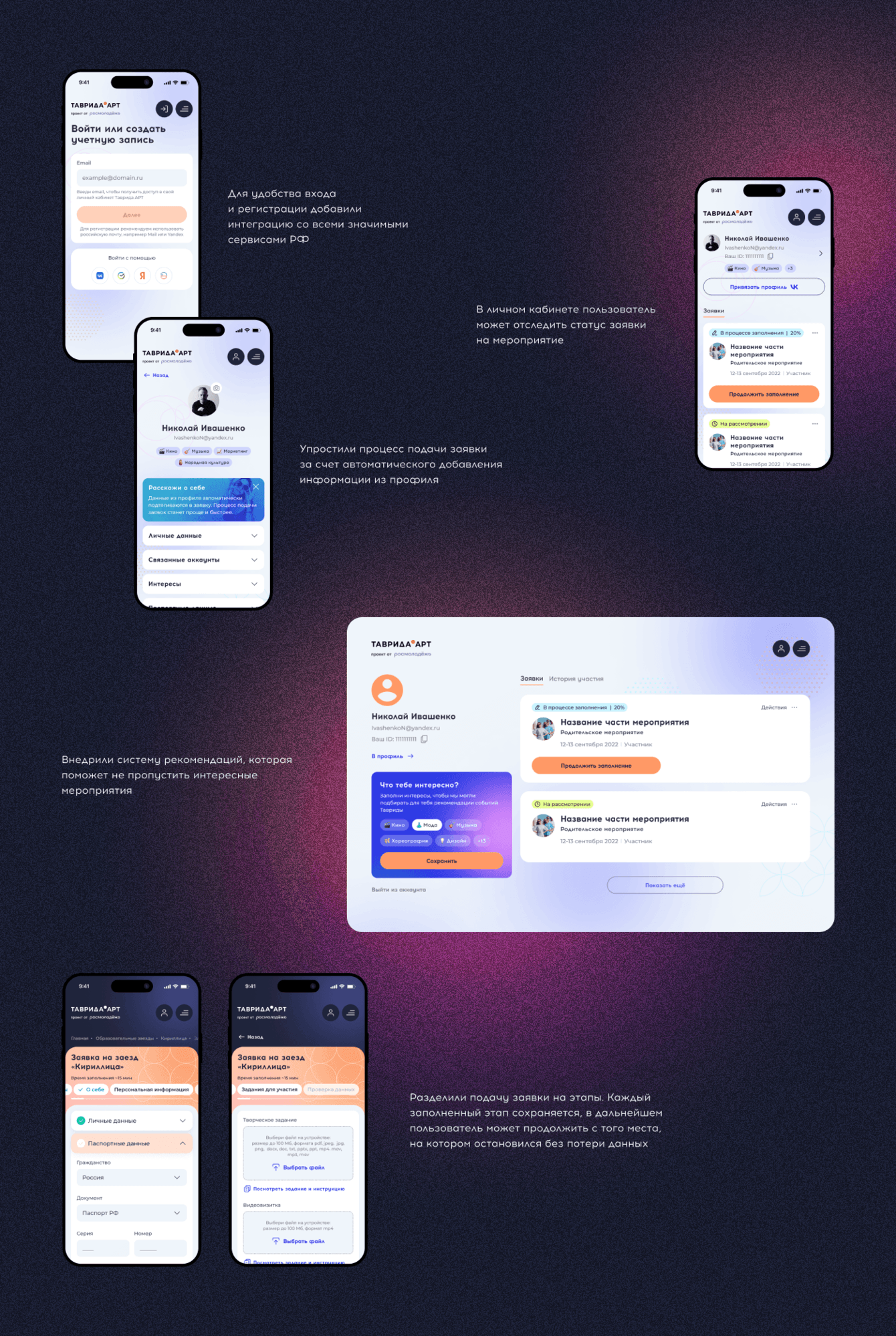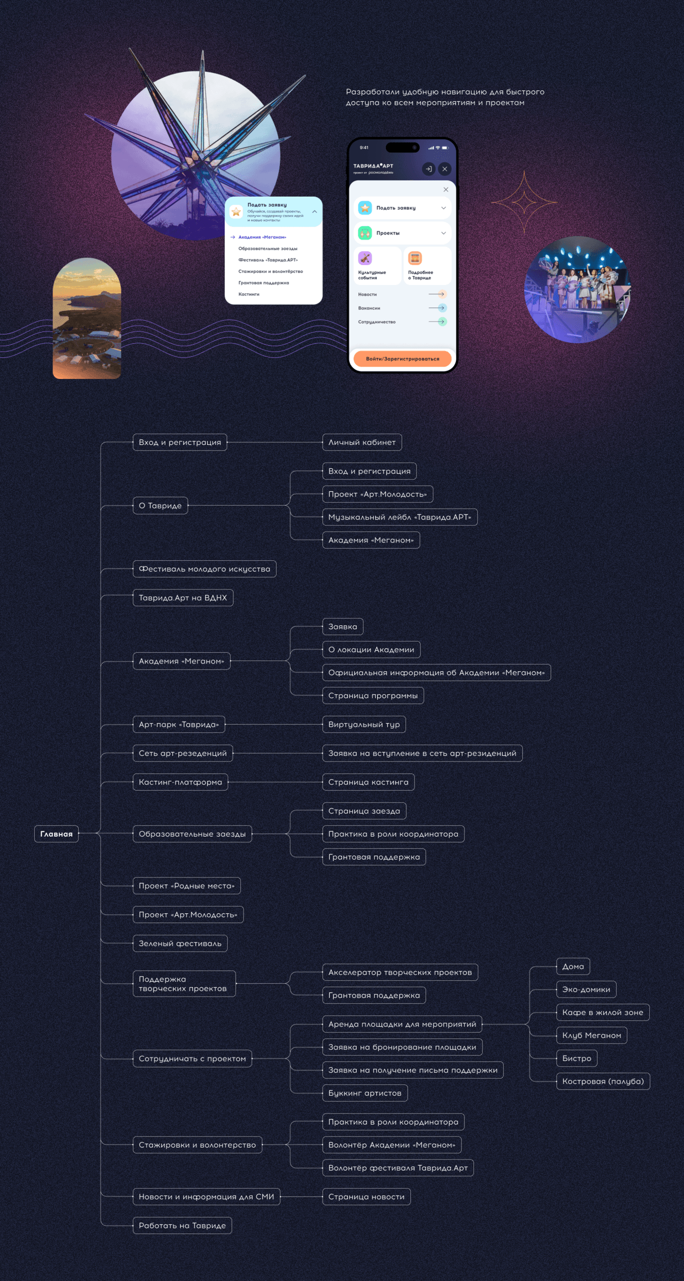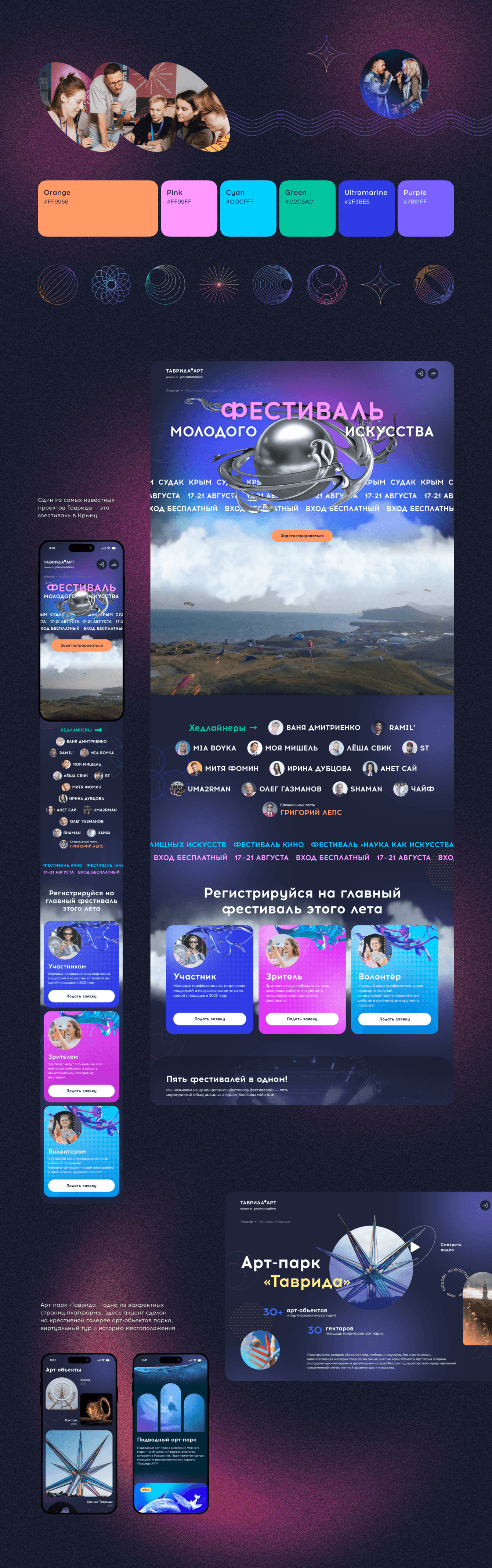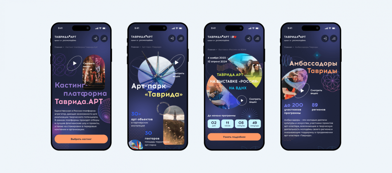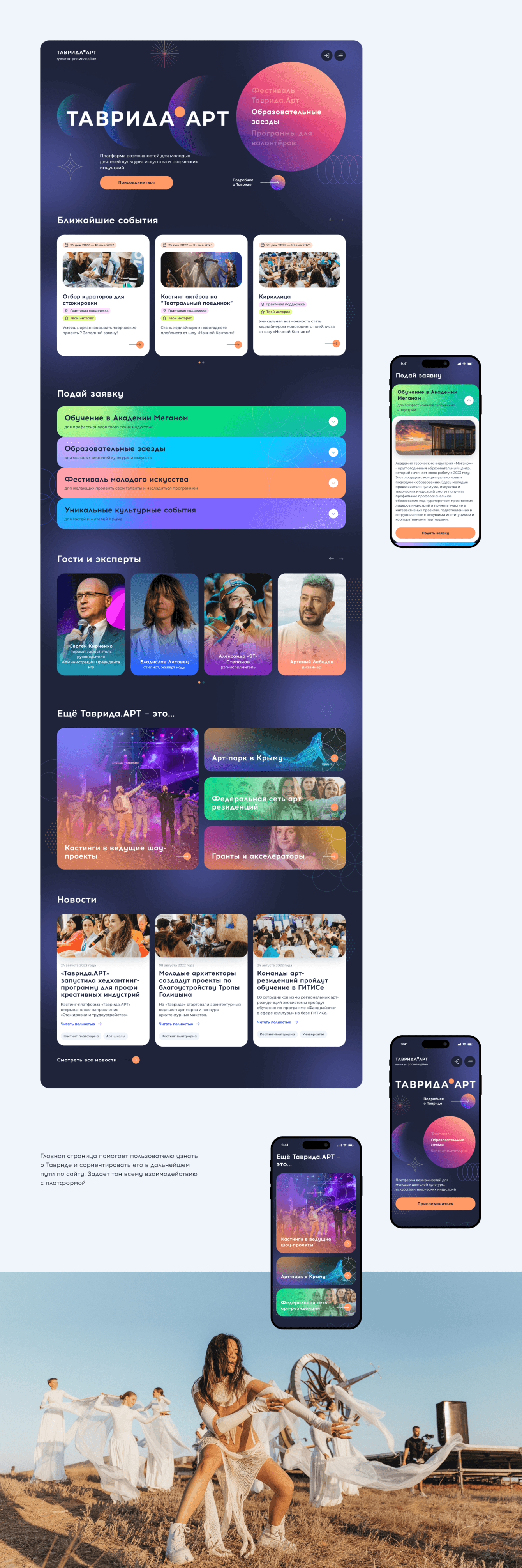 Мы пересмотрели и оптимизировали весь процесс взаимодействия с экосистемой «Таврида.Арт». Создали сайт, состоящий из десятков уникальных страниц. Спроектировали пользовательские пути, интуитивно понятный интерфейс, обновили структуру и навигацию, упростили и оптимизировали регистрацию и форму заявки на мероприятия, автоматизировав процессы. Каждую страницу наполнили ярким визуальным стилем и анимациями, чтобы привлечь внимание и удержать интерес пользователей.