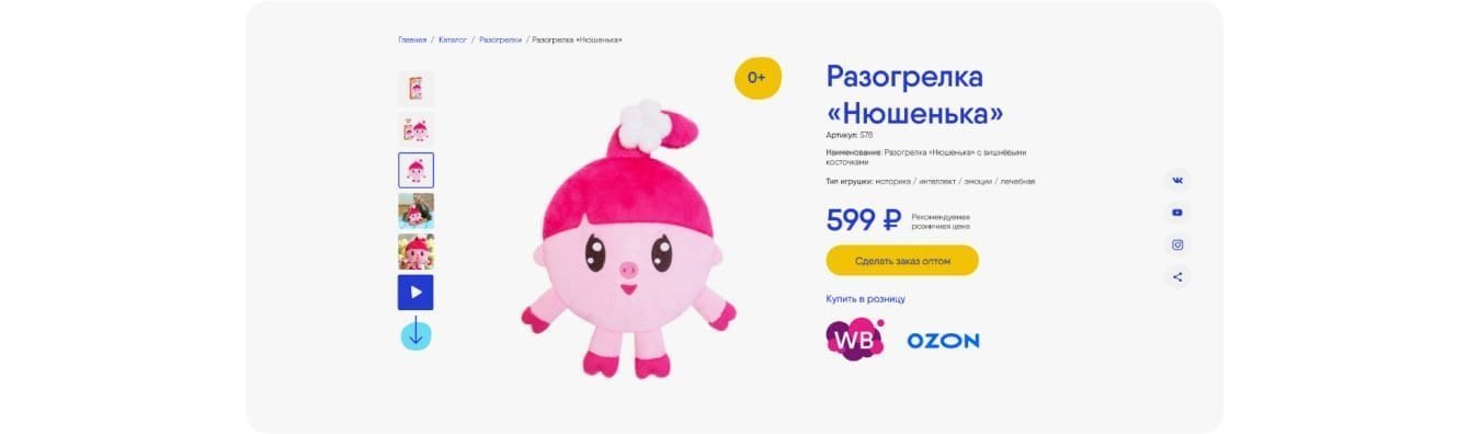 В карточке товара важно было показать игрушку максимально подробно. Тем более у клиента было много фотографий отличного качества, снятых с разных ракурсов с примерами использования игрушки. Для каждой игрушки предусмотрено подробное описание с рекомендуемой розничной ценой, характеристики и отзывы, а также сертификаты качества. Вместе это должно помочь покупателям с выбором. В товарную карточку были добавлены ссылки на маркетплейсы для b2c-клиентов, которые хотят купить игрушки прямо сейчас.