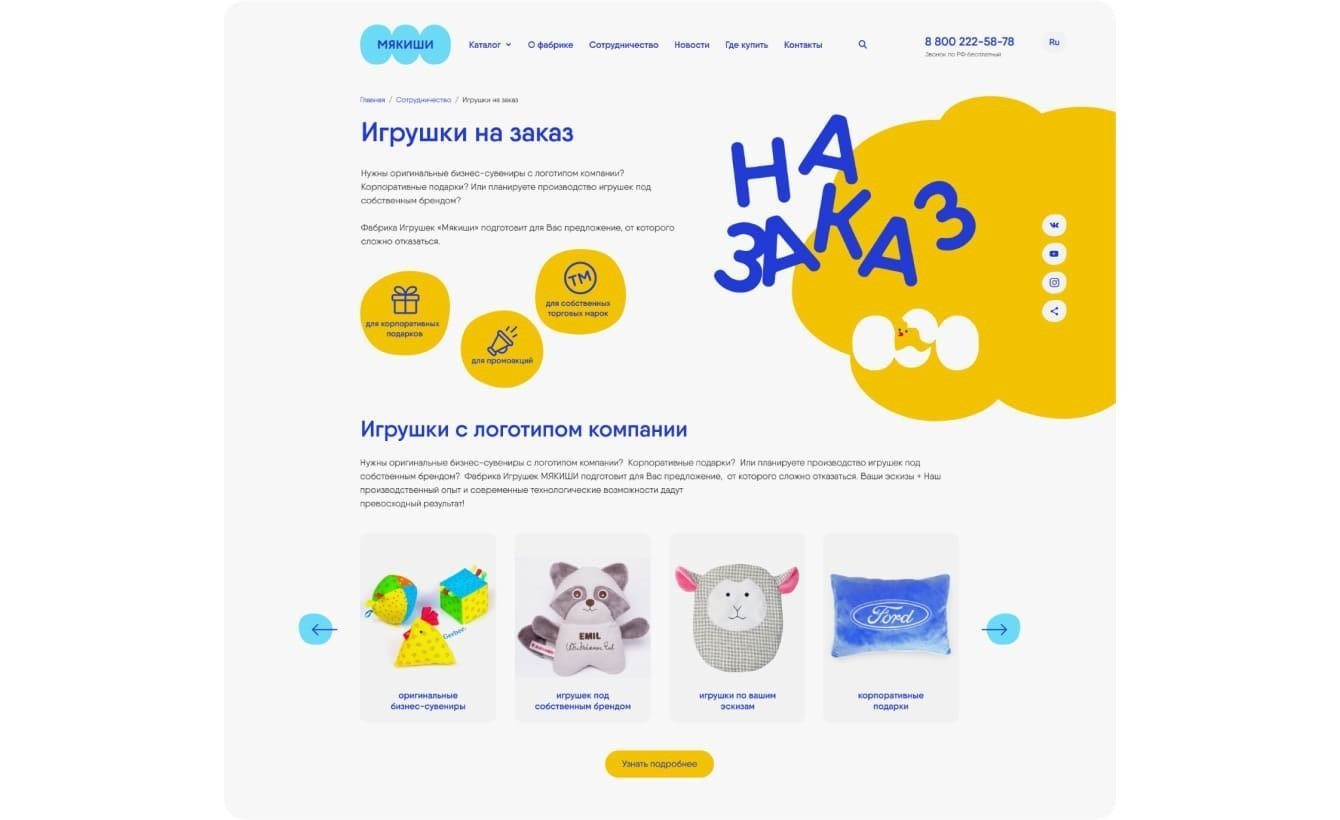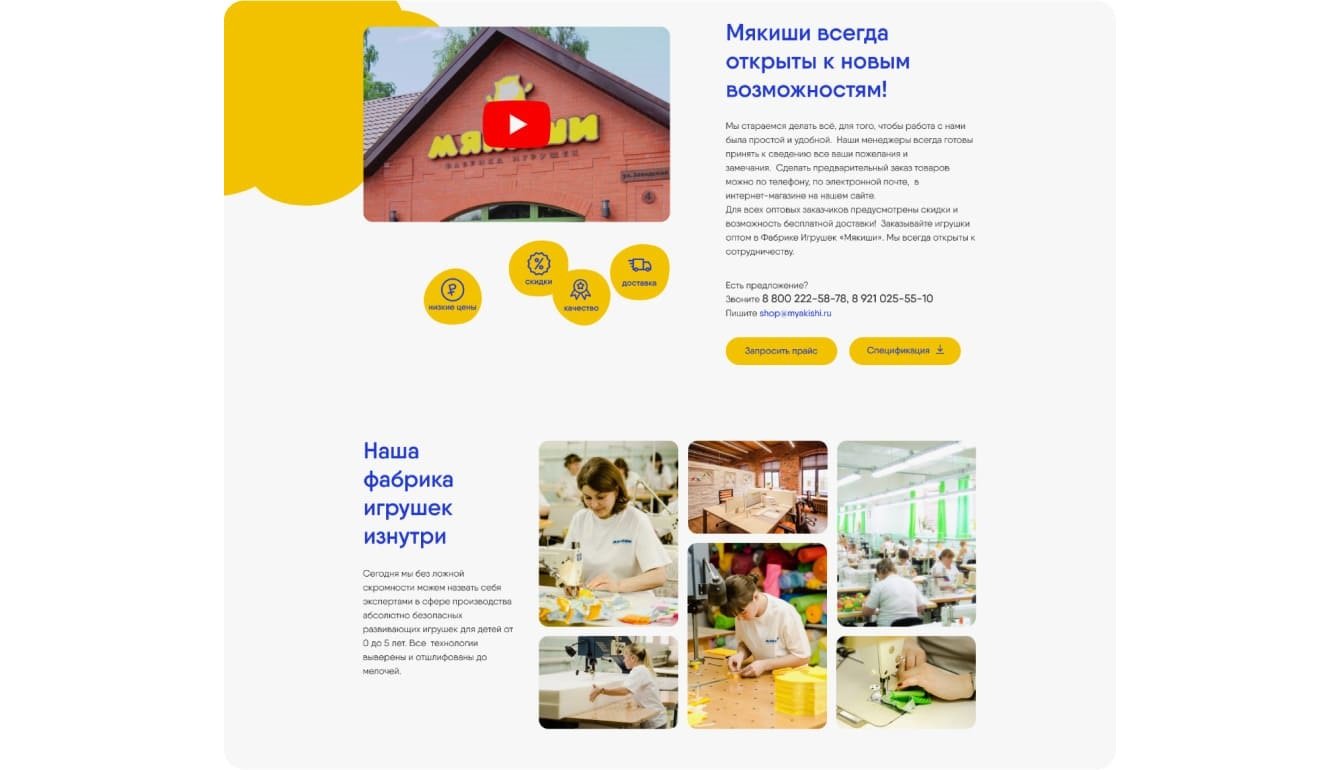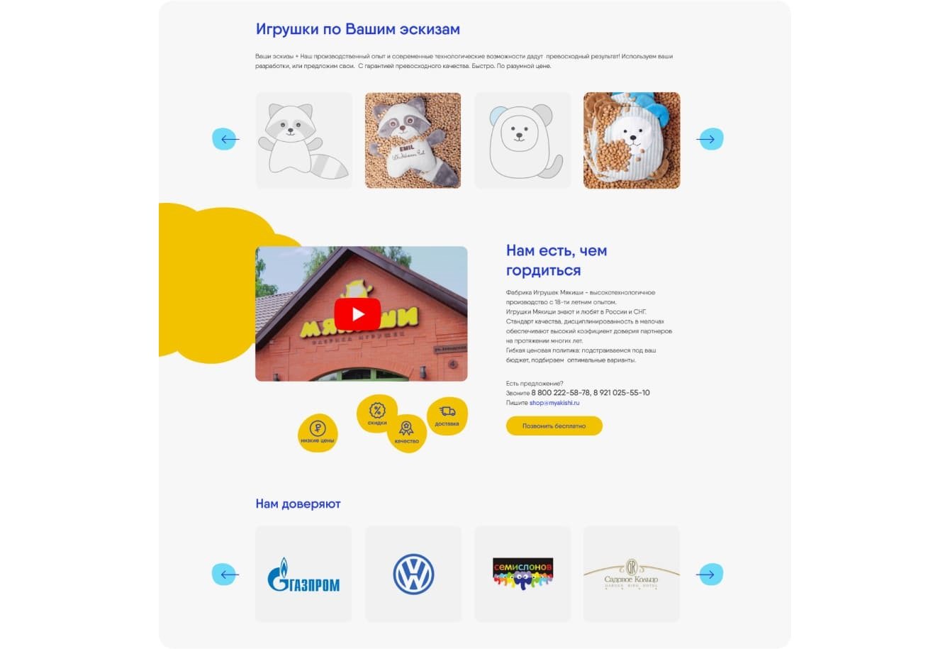Игрушки фабрики «Мякиши» пользуются большим спросом. Сайт должен показать это, объяснить все выгоды сотрудничества и предоставить возможность быстро получить информацию о том, как оформить заказ оптом.
