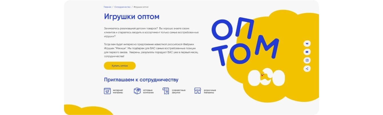Для оптовых клиентов были разработаны отдельные страницы — «Игрушки оптом» и «Игрушки на заказ». В первом случае было важно показать условия сотрудничества, возможность скачать спецификацию продукции и получить контакты отдела продаж.
