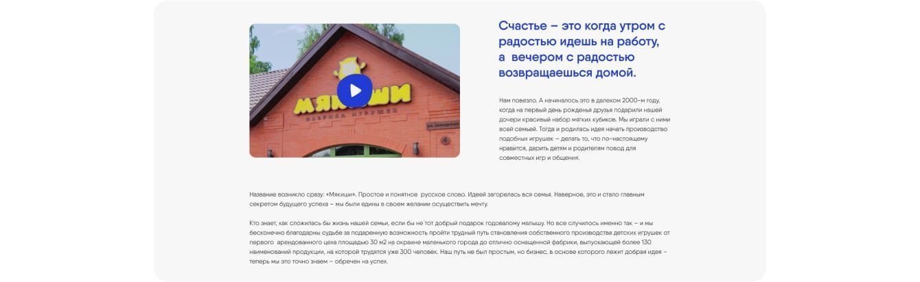 Для решения этой задачи был разработан раздел «О фабрике», в котором важно было показать информацию о производстве и донести ценности бренда. Мы разместили краткое описание и особенности выпускаемых игрушек — почему они так популярны, и какую роль играют в детском развитии.