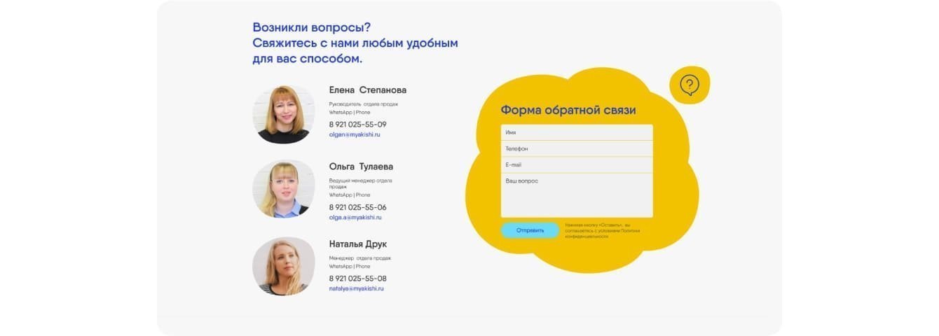 Для усиления доверия к бренду фотография и контакты основателей стали логичным завершением этой страницы.
