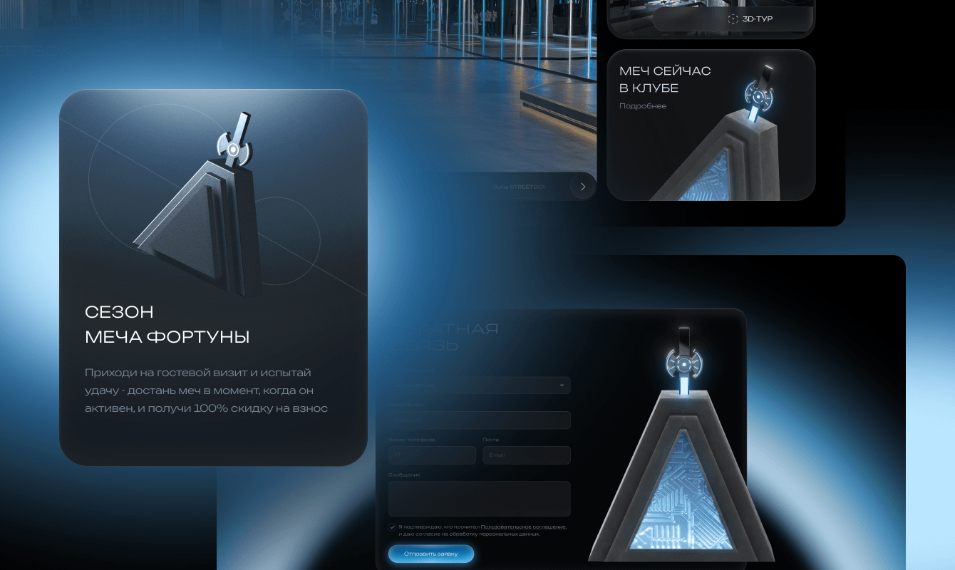 Отдельное пожелание клиента — интегрировать в дизайн фирменный клубный «меч фортуны», который путешествует по клубам. Когда человек приходит на гостевой визит, то может испытать удачу: попробовать достать его в момент, когда меч активен. Если вытащит — получит 100% скидку на взнос.