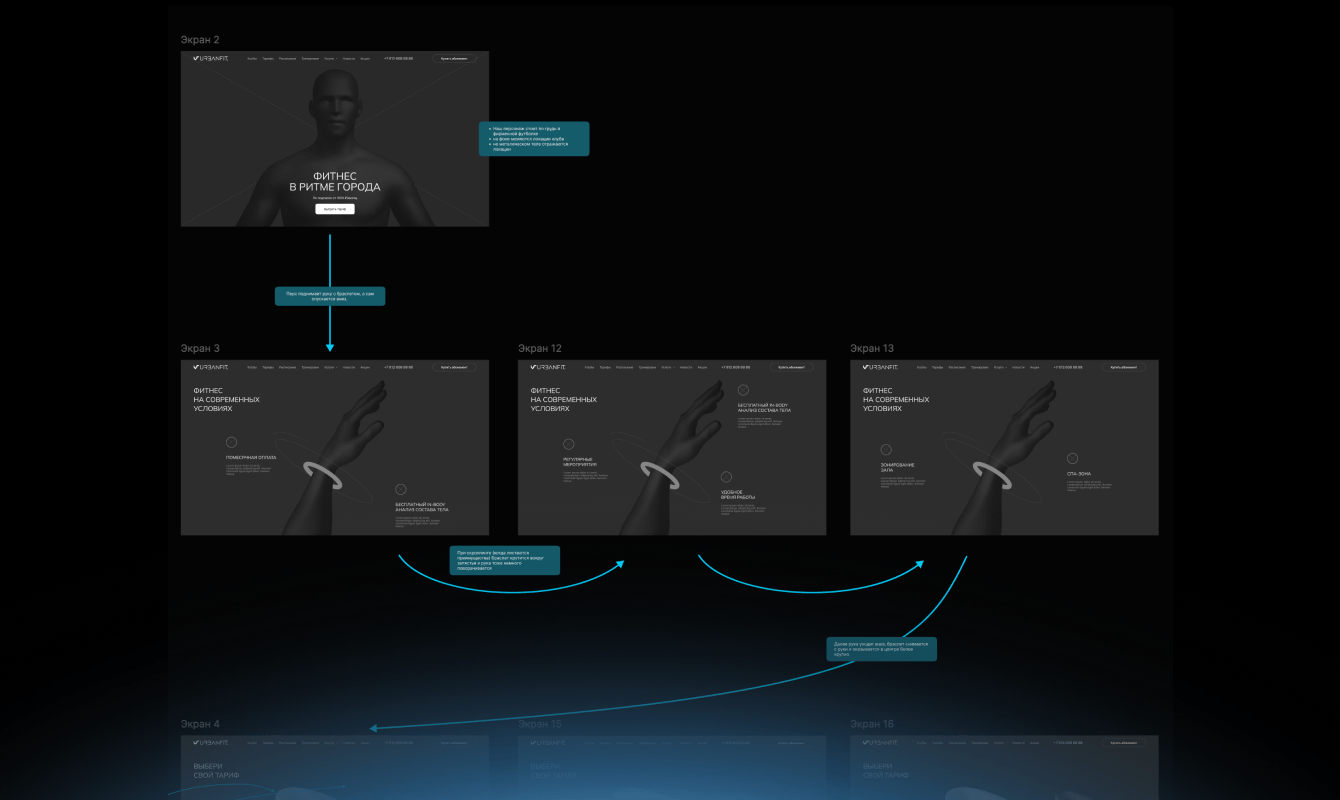 На основе этой структуры сделали прототипы ключевых страниц и путей — от первого визита до покупки абонемента. Согласовали их с командой URBANFIT. и перешли к дизайну и 3D.