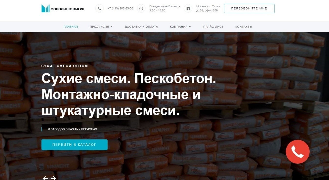 • широким функционалом, который включал возможность оперативной связи с продавцом (заказ обратного звонка, онлайн-заявка на поставку строительных смесей с последующим звонком менеджера);