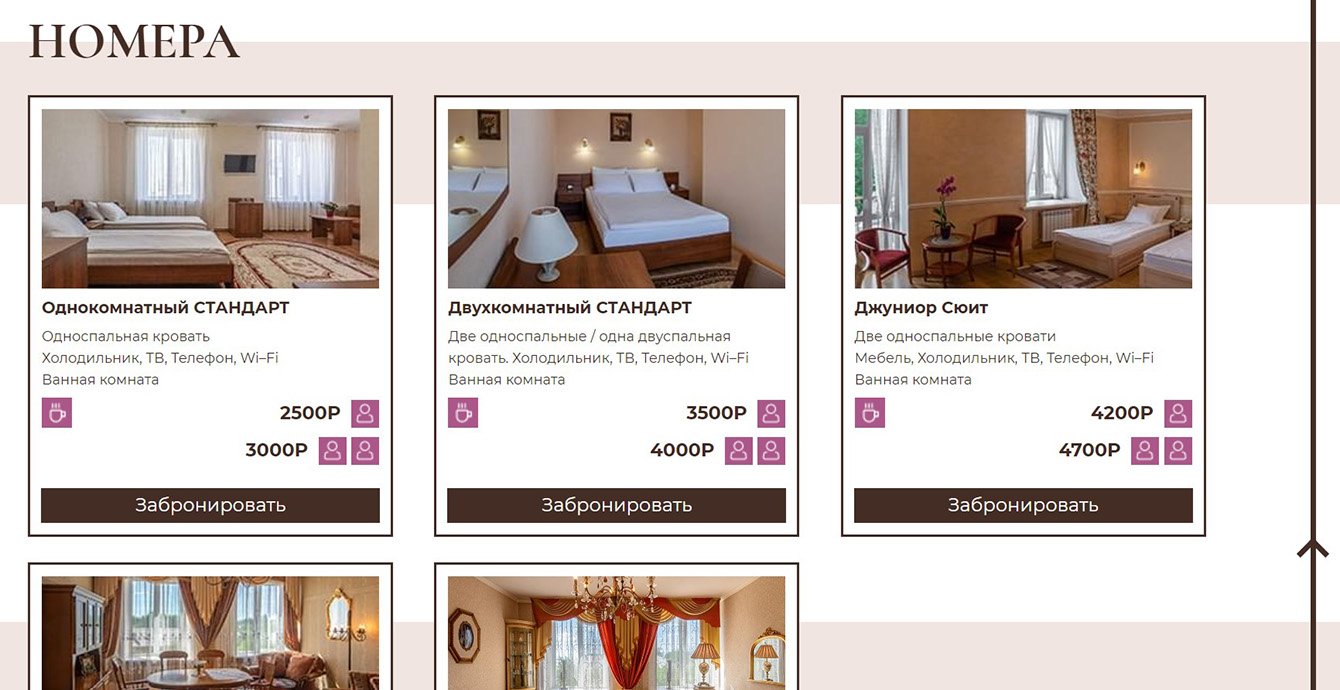 Предыдущий сайт был сделан в середине 2000х годов и уже не соответствовал по дизайну и функционалу современным сайтам гостиниц. Из явных недостатков: не было возможности бронирования номеров онлайн, невозможно было расплатиться онлайн с банковской карты, не было красивых фотографий самой гостиницы и т.п.