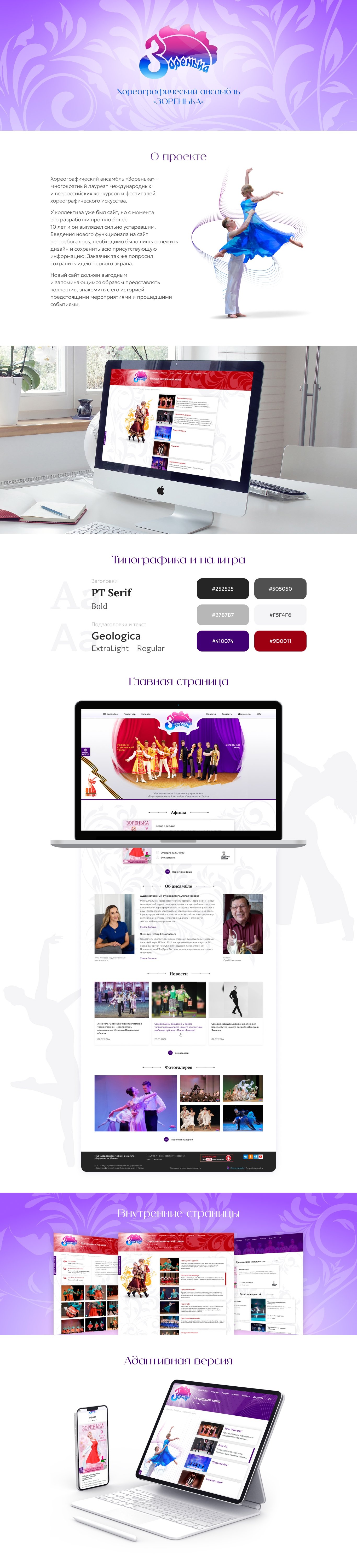 У коллектива уже был сайт, но с момента его разработки прошло более 10 лет и он выглядел сильно устаревшим. Введения нового функционала на сайт не требовалось, необходимо было лишь освежить дизайн и сохранить всю присутствующую информацию. Заказчик так же попросил сохранить идею первого экрана.