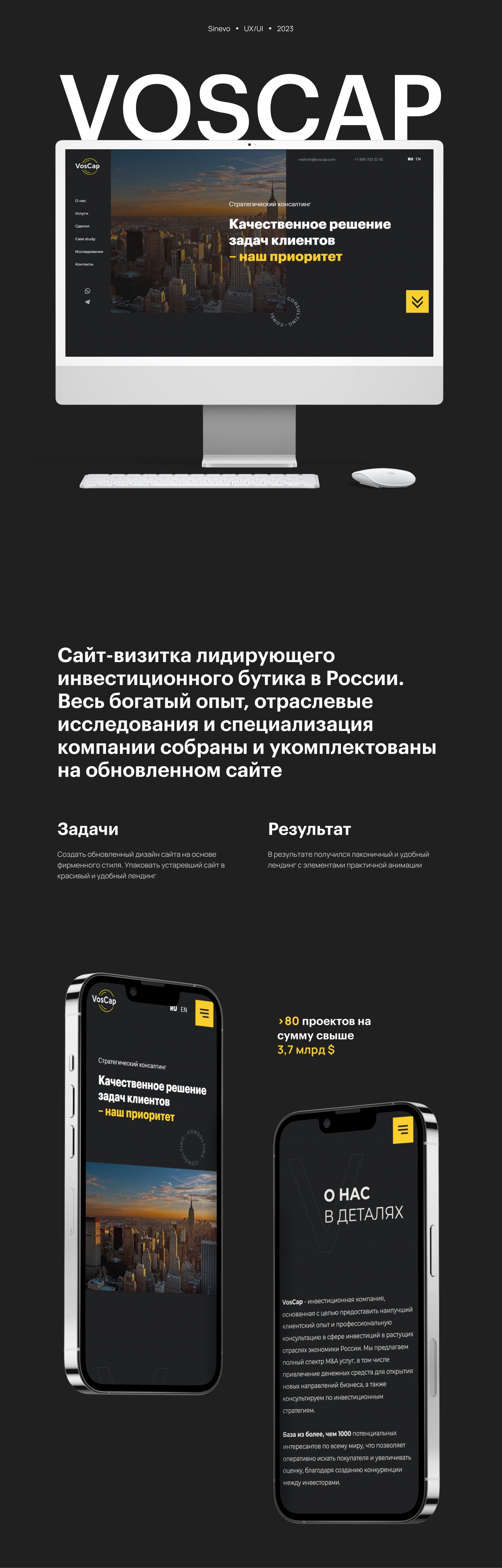 VosCap оказывает услуги инвестиционного банковского сопровождения, включая полный спектр M&A услуг. Перед нами стояла задача сделать новый дизайн и создать новый образ для компании с помощью обновленного сайта.