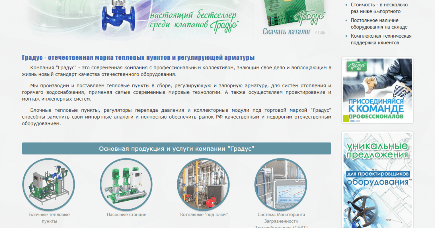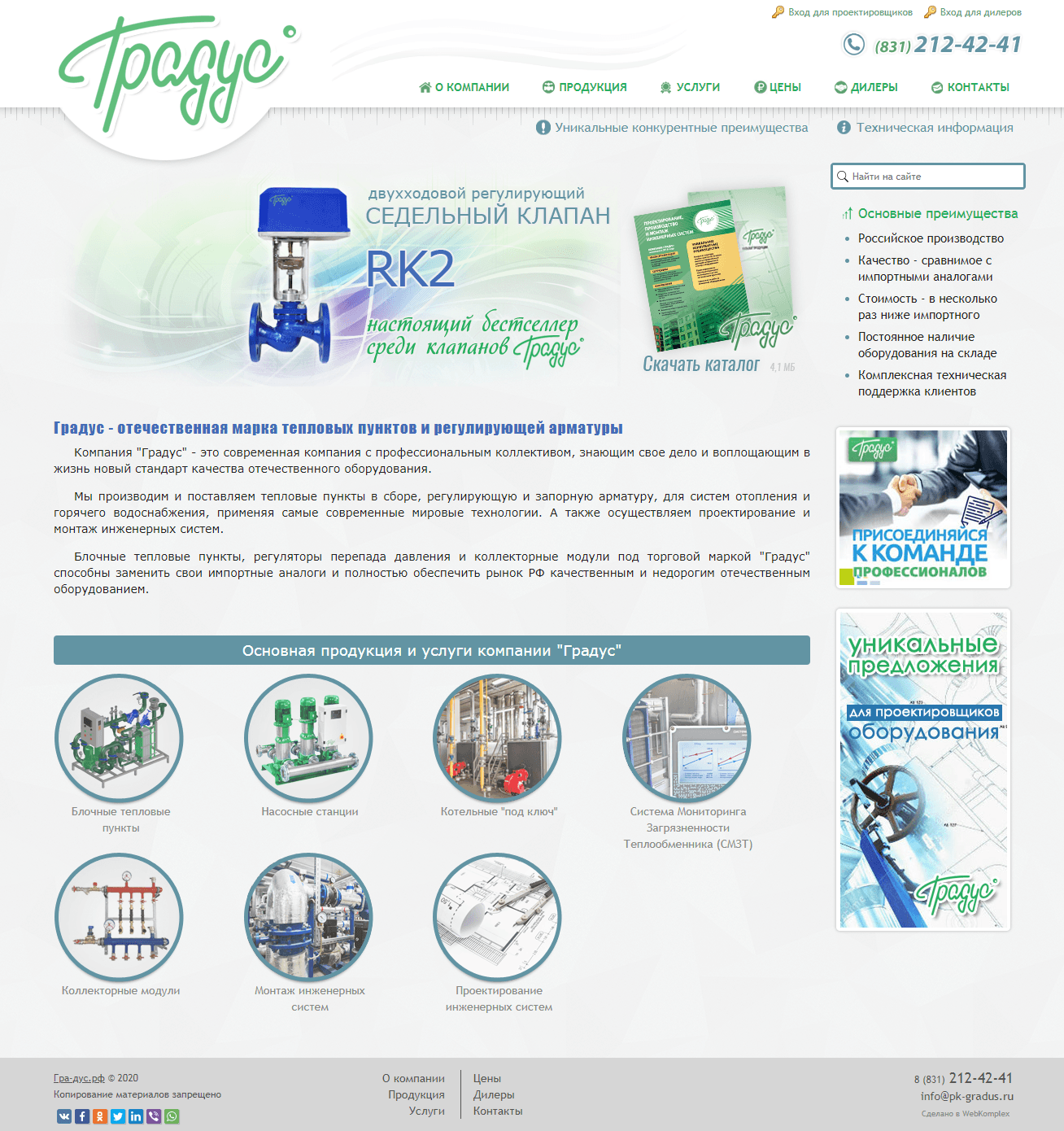 Отечественный производитель терморегулирующего оборудования - компания "Градус" благодарит Нижегородскую студию "WebKomplex" за создание сайта для торговой марки "Градус". Нами была поставлена не простая задача создать корпоративный сайт с фирменным дизайном и личным кабинетом для возможности работы проектировщиков инженерных систем.