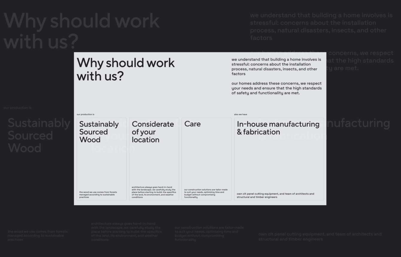 Основатели компании – опытные строители, которые строят дома по различным технологиям на территории Канады. Для их нового направления деятельности – строительство домов из CLT панелей – необходимо было реализовать отдельный сайт, который демонстрировал бы клиентам преимущества этого строительного материала. Показать, что из него можно строить не только частные дома, но и многоэтажные, общественные и промышленные сооружения.
