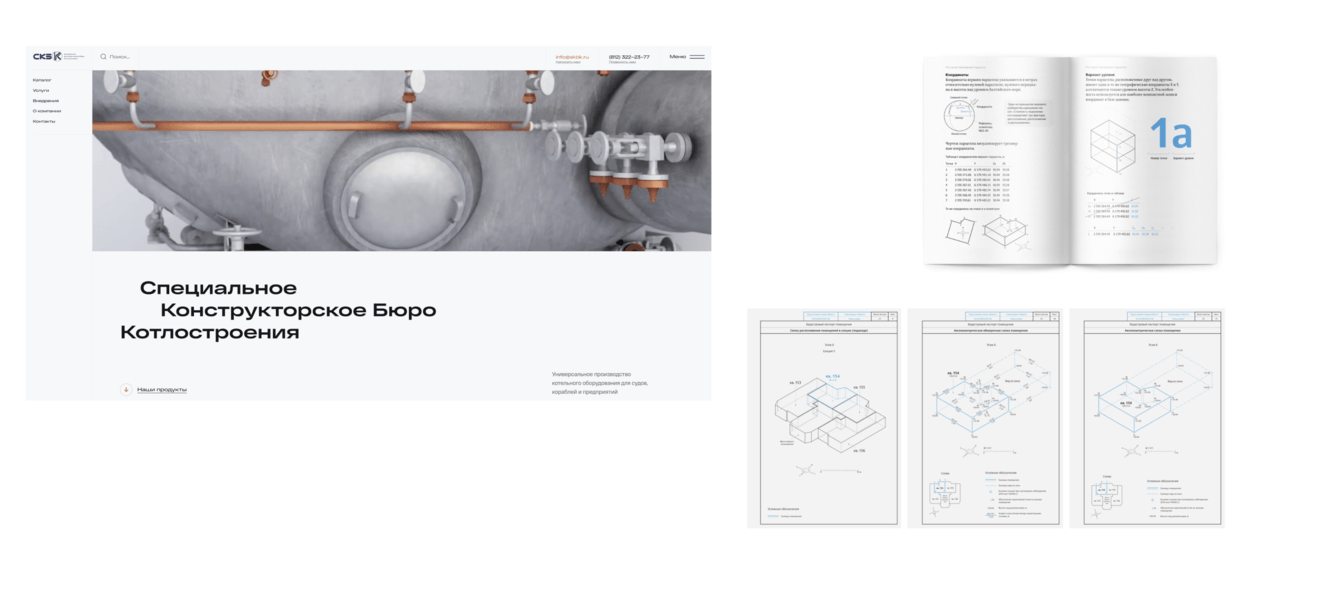 В качестве опорных референсов, которые понравились закачику, были сайт конструкторского бюро и брошюра с 3д чертежом.