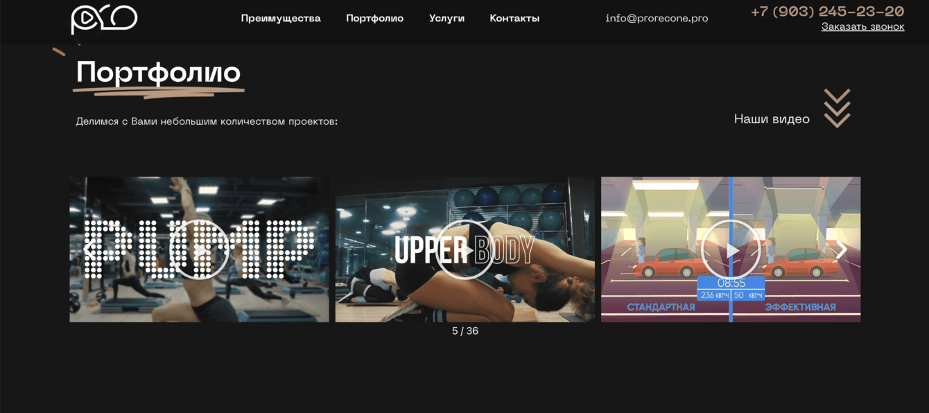 Prorecone — профессиональная видеостудия, которая реализует проекты «под ключ»: от сценария и съёмок (включая дрон и многоканальную съёмку) до монтажа, графики, цветокоррекции, озвучки и онлайн-трансляций. Работают со спортивными, корпоративными, рекламными видео — на любых площадках.
