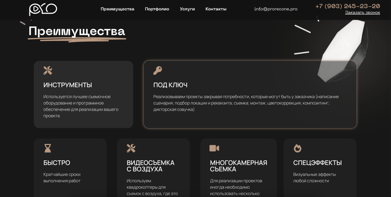 Представляет Prorecone как профессиональную и технологичную студию.