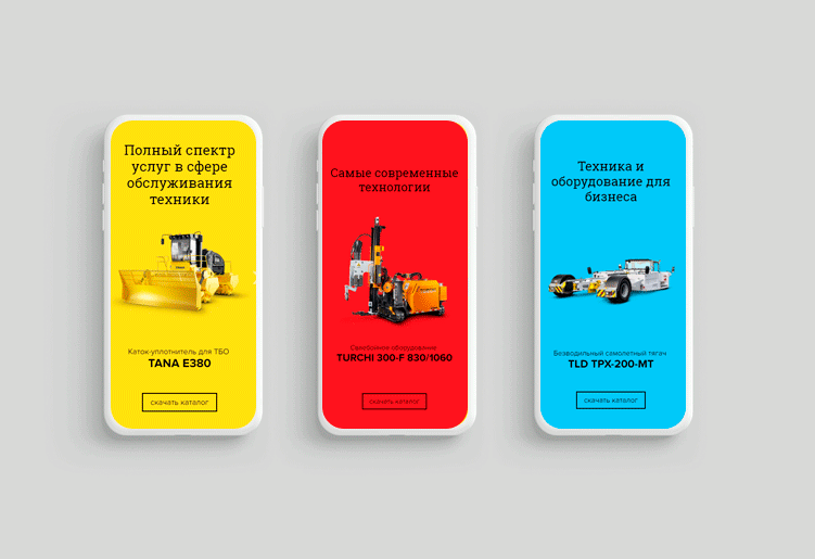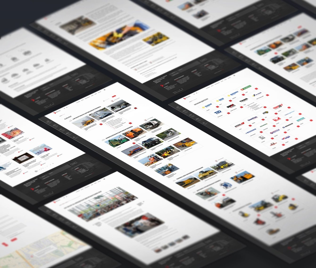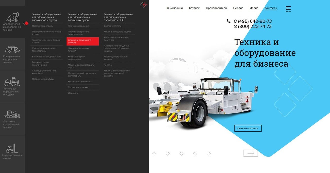 Сделан акцент на визуализации основных видов продукции компании. Каждому типу техники соответствует свой уникальный фон.