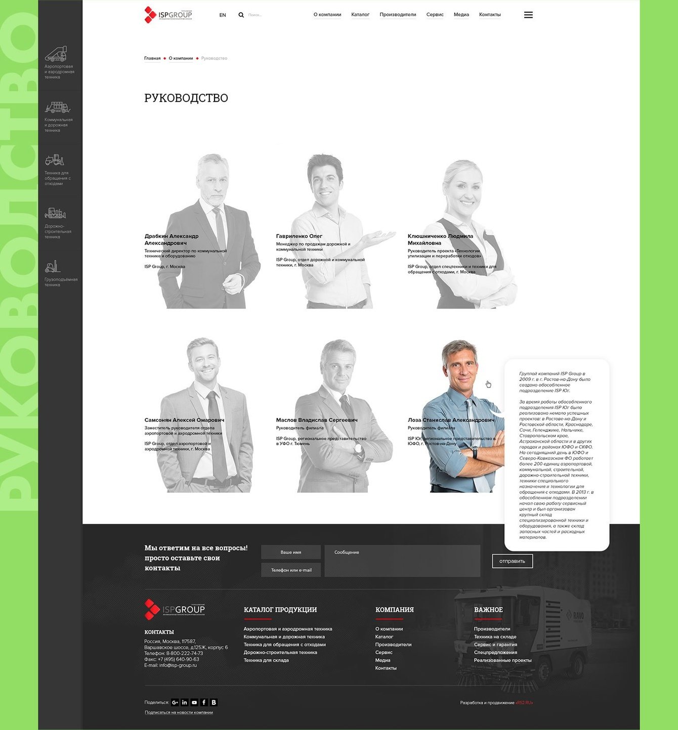 Страница, где руководители ISP GROUP знакомят пользователей с историей и достижениями компании, а также с интересными бизнес-кейсами.