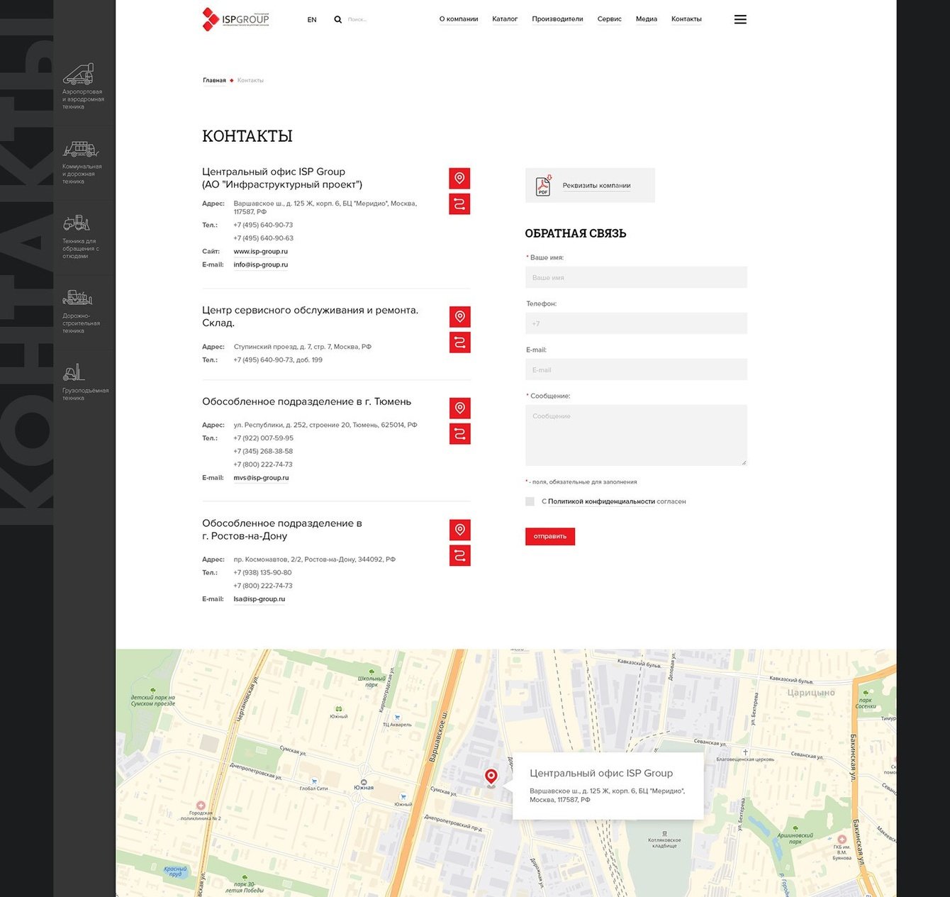 Страница содержит форму обратной связи, а также реквизиты, адреса, схемы проезда, телефоны и электронные почты всех подразделений компании в Москве и регионах.
