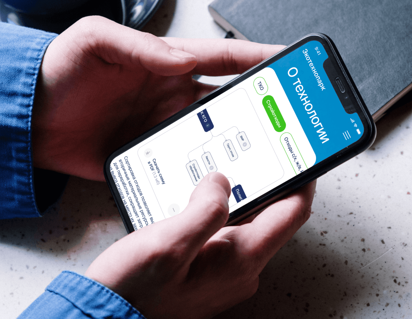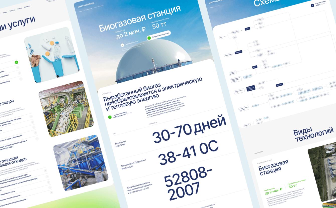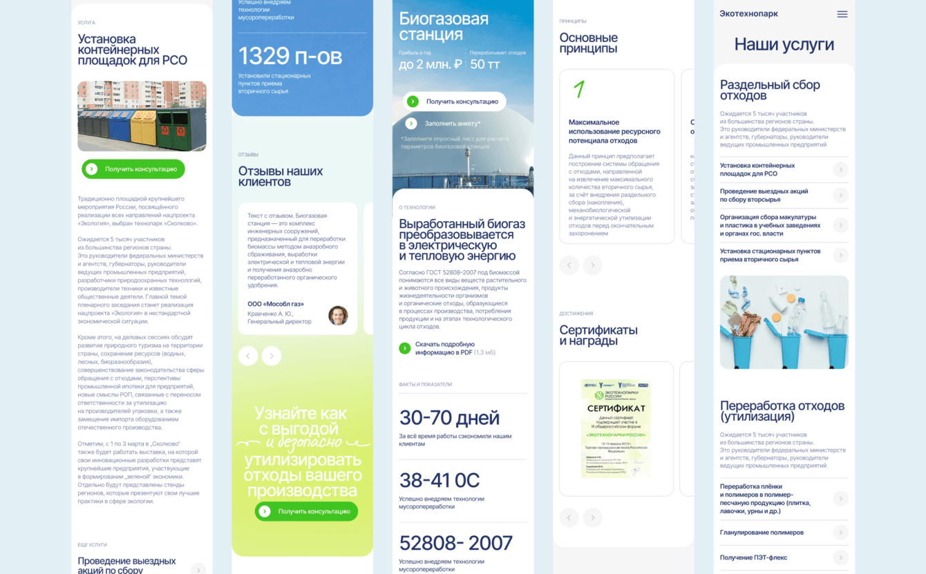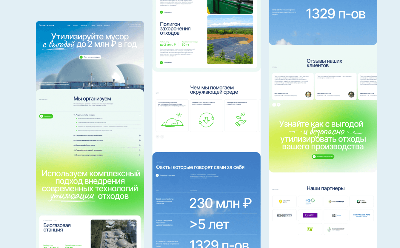 Мы разработали удобный и информативный сайт для компании «Экотехнопарк», которая помогает предприятиям организовать утилизацию производственных отходов, настраивая процессы сортировки и повторного использования. В основе дизайн-концепции использовали простые округлые формы и крупную рукописную типографику, а нежные градиенты природных оттенков добавили сайту легкости и помогли выделить важную информацию. На главной странице акцентировали внимание на комплексных услугах компании, снижая фокус на дополнительных компетенциях. Реализовали анимации появления контента и иконок при прокрутке страницы, а также разработали 15 страниц, включая схему технологического процесса переработки различных отходов с возможностью ее скачивания в формате PDF. Сайт адаптирован для корректного отображения на различных устройствах и браузерах, а также содержит оригинальную страницу 404, поддерживающую общую стилистику. Кроме того, мы сформировали визуальные правила для коммуникации компании с клиентами, включающие рекомендации по работе с цветами, шрифтами, иллюстрациями и выравниванием элементов на различных форматах макетов.